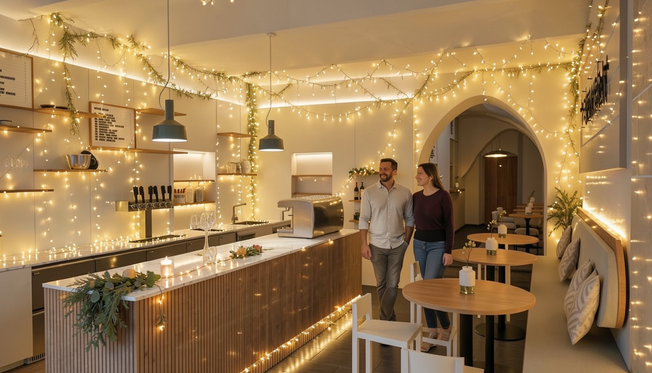 make realistic warm lighting at rush hour a fall evening with leaves on the ground people going home from work storefront is a restaurant