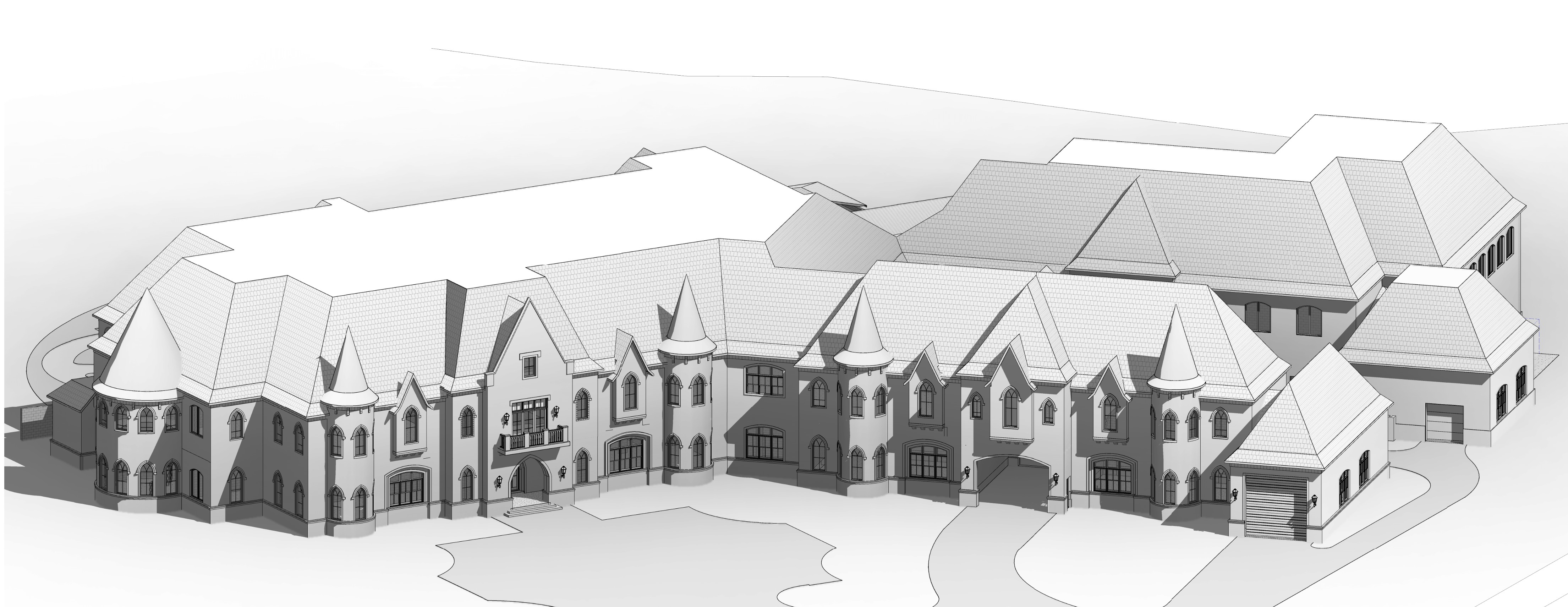 archsynth prompt luxury mediterranean coastal estate tarpon springs fl strict maintain exact building geometry massing proportions rooflines openings and camera perspective from the input model do not alter structure layout or architectural features project context luxury waterfront estate located in tarpon springs florida inspired by mediterranean coastal resort architecture with a refined high end residential feel material direction architect s choice cohesive realistic primary walls smooth white stucco with subtle texture warm white not stark accent walls towers light natural limestone or shell stone florida coastal tone roofing aged terracotta barrel tile roof slight color variation for realism trim windows bronze or dark anodized aluminum frames garage doors wood look carriage style or modern plank wood in a warm tone balconies railings black or dark bronze metal with simple elegant detailing entry features arched openings with deeper shadow lines for depth site landscape important elevate the rendering lush florida coastal landscaping tall palm trees royal sabal palms layered tropical planting ornamental grasses agave low shrubs clean upscale driveway light shell stone or sand colored pavers soft landscape lighting integrated subtly add slight curvature and natural planting flow not overly manicured lighting atmosphere time of day golden hour late afternoon sunset glow warm sunlight hitting stucco and stone with soft long shadows slight sky gradient with light clouds for realism subtle reflections on windows hint of nearby water influence rendering style ultra photorealistic architectural magazine quality clean sharp edges with realistic material textures balanced exposure not overdramatic emphasize depth through shadows in arches recesses and towers constraints do not introduce new architectural elements do not change proportions roof shapes or window placements avoid overly busy landscaping keep it elegant and intentional no people vehicles or clutter focus on architecture
