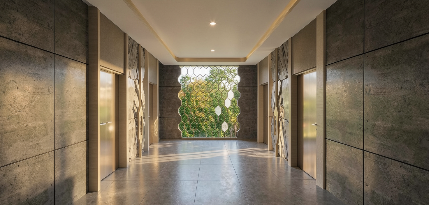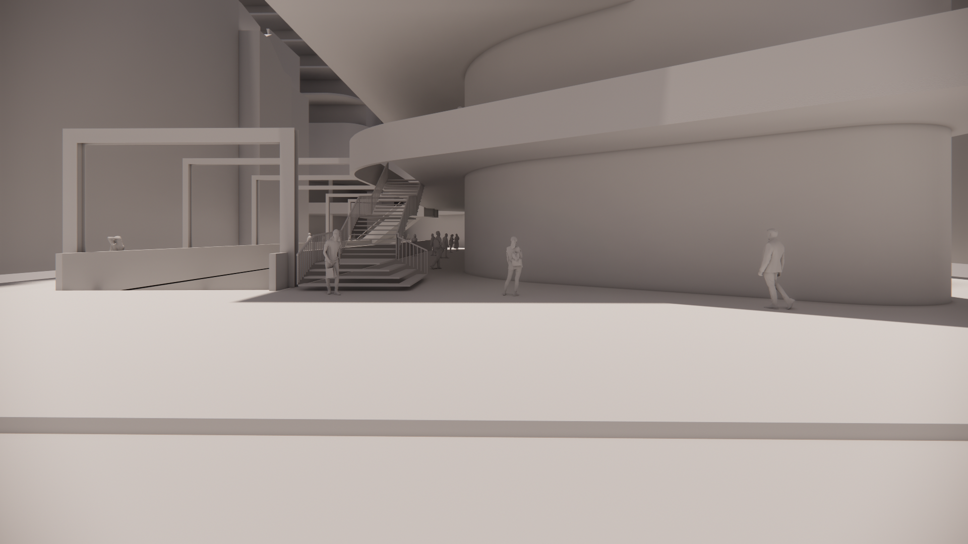 make the attached image look like a central city vibrant plaza the forms on the right need to be full height shop front glazing with a commercial inner city high end bespoke design feel maintain the subtle curves in the facade the foreground is a bitumen road and the plaza floor surface should be a light charcoal large format stone paver with bush hammered surface there should be a mixture of students and office workers in the plaza both walking and seated place a single organic shaped planter slightly offset from the centre with timber seating around it facing outward the far left hand side should retain the same geometry but look like exposed brick the ceilings of both the upper and lower areas should have downlights and timber lined ceilings make sure there are people on the upper level balcony as this area should feel connected to the lower level visually the sun light should be coming from directly overhead