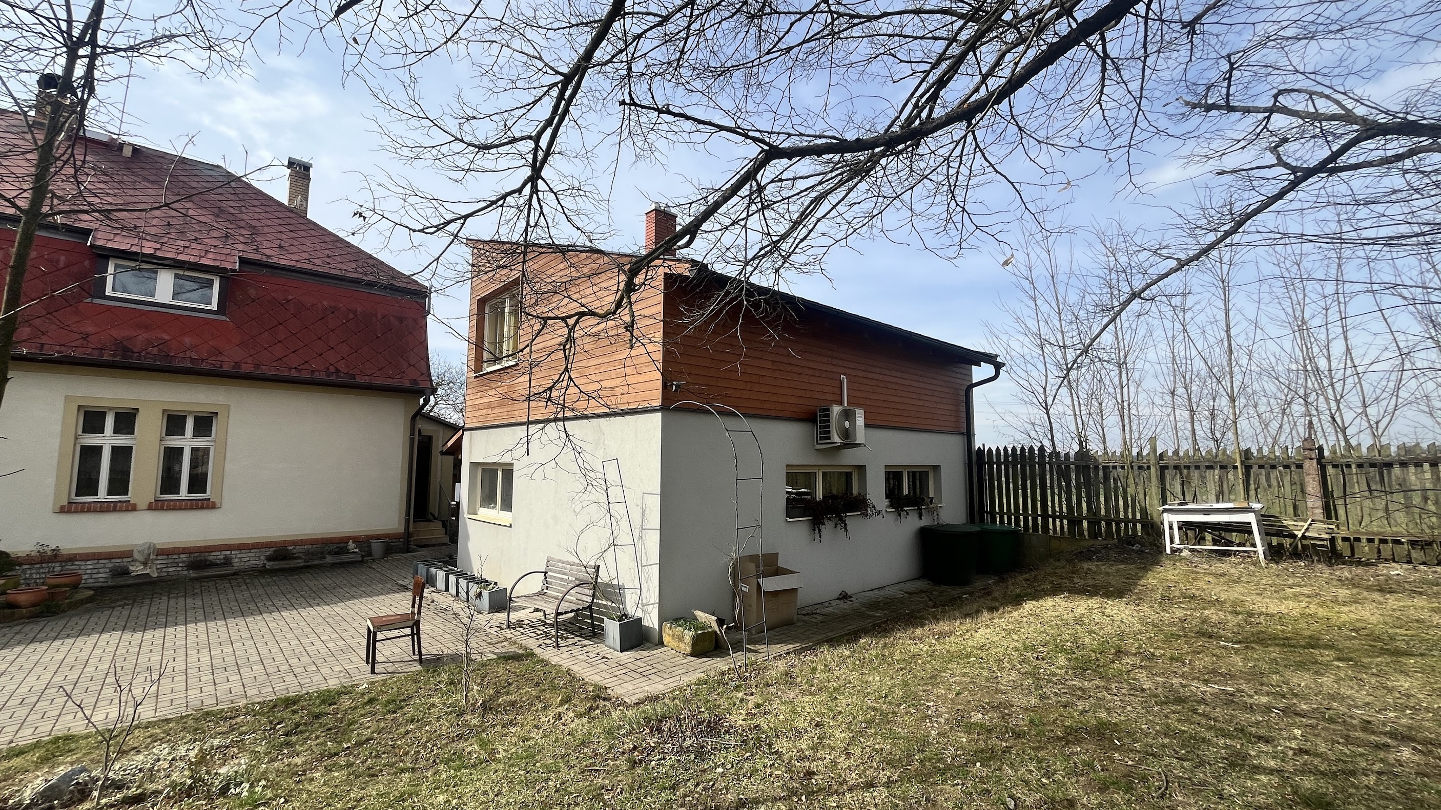 completely change the material of the facade of the front building so it is in stark contrast to the background building use swisspearl materials on the whole facade to do this keep the back building as is don change it do not change windows on the front building
