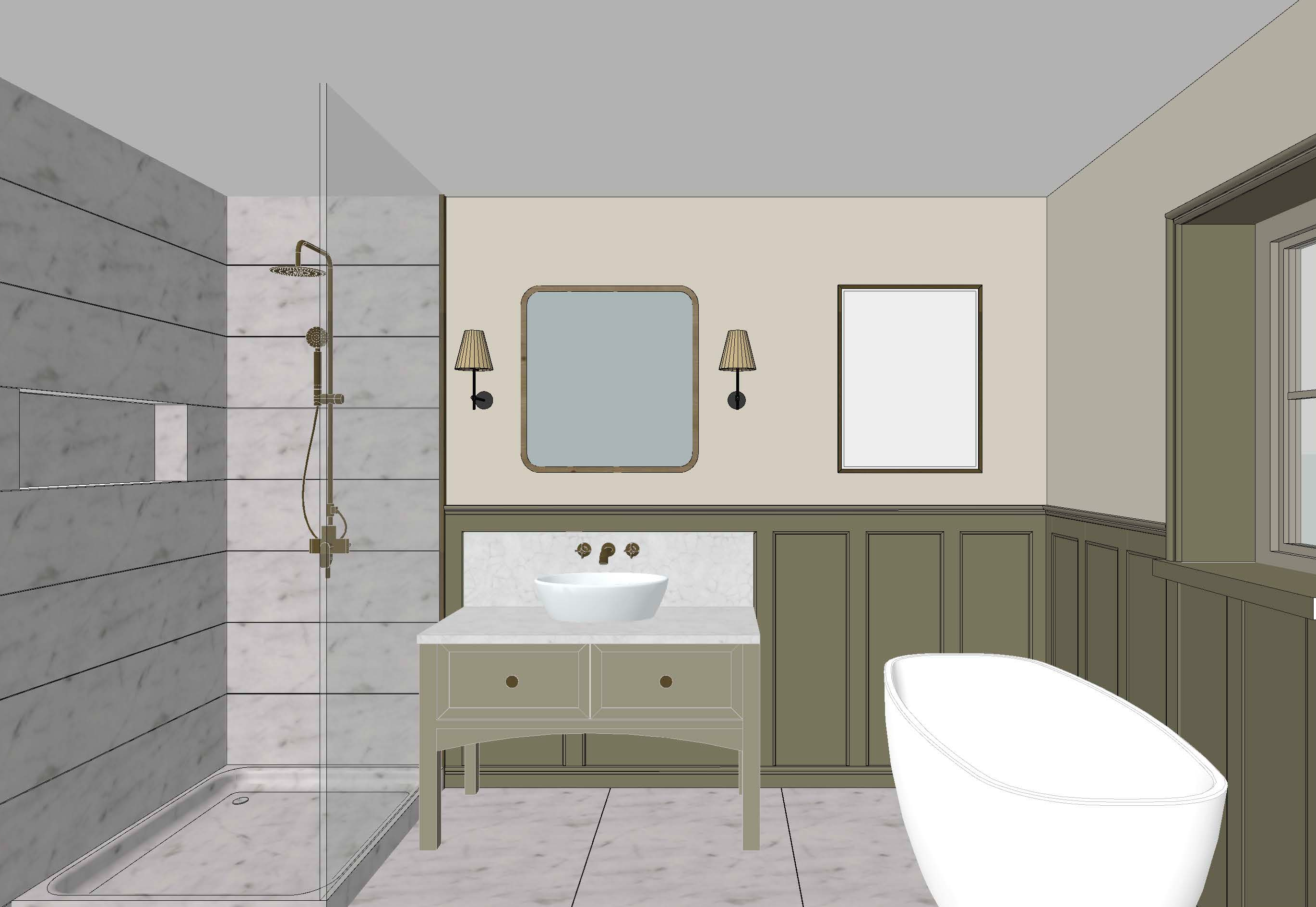 there is a mirror above the sink and a picture frame above the bathtub