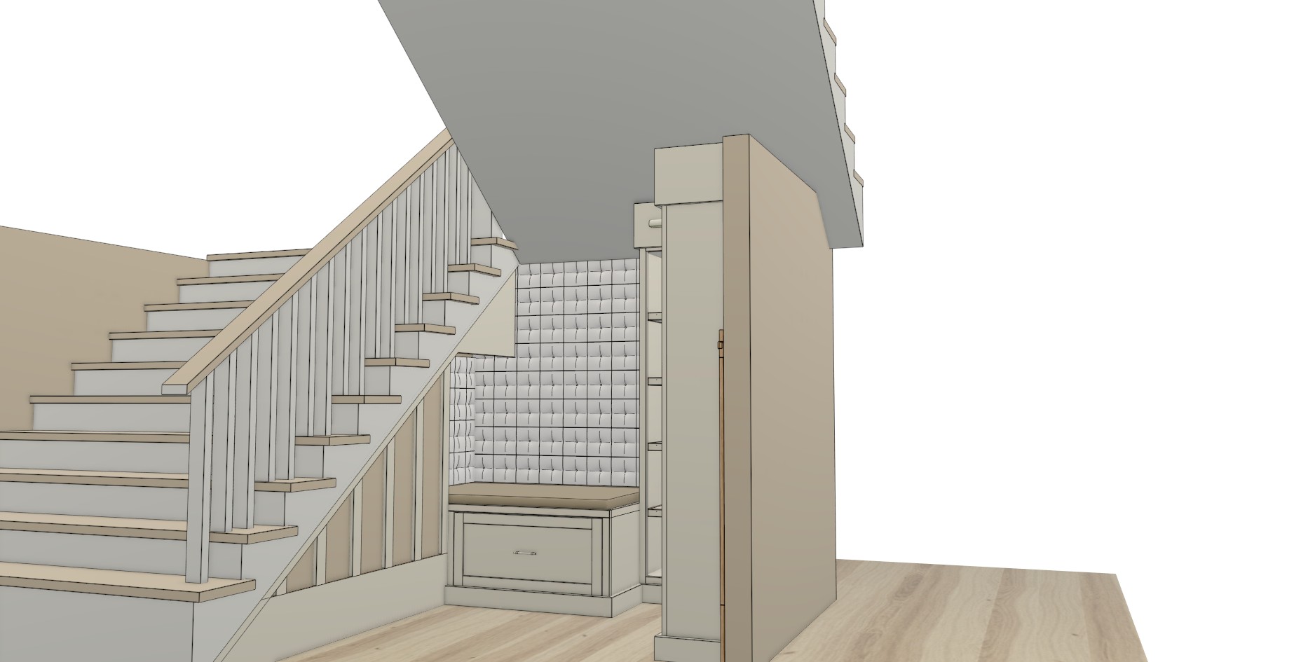 this is an l shelf bookshelf built under a stair case there is padded seating area with a padded wall on the left the stair risers and balusters are black the floor railing and stair tred are all a medium brown stain the cabinet are painted white