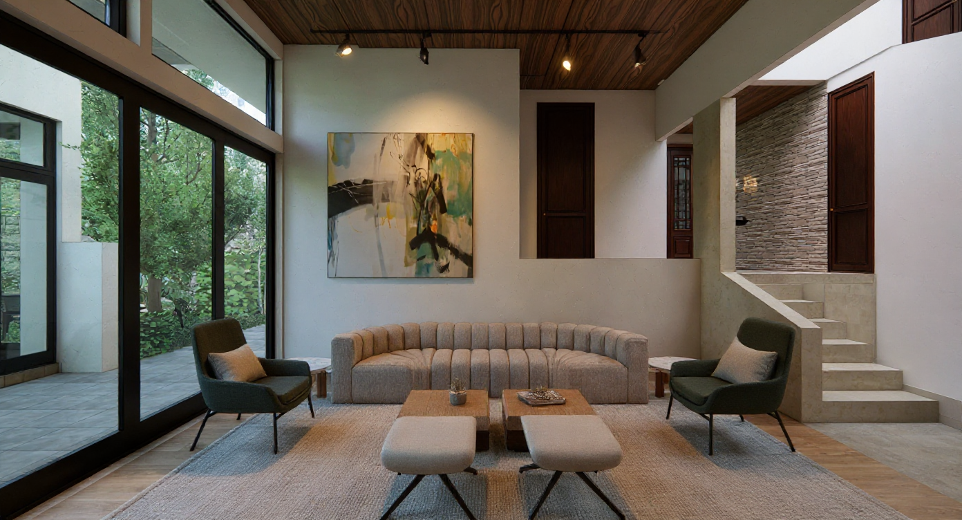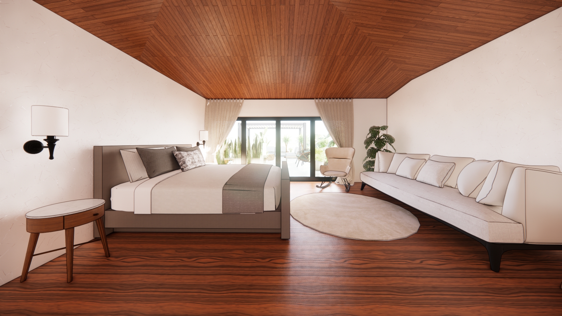 improve this bedroom render while keeping the existing furniture layout enhance the material textures walls fabrics wood and flooring for a more realistic and refined appearance add subtle modern decorative elements on the nightstands such as lamps books or small sculptures include a few decorative cushions on the sofa that complement the room s color palette and incorporate modern wall art to add personality and style improve the lighting by adding warm realistic light sources and include a ceiling track lighting system to create depth and highlight key areas of the room