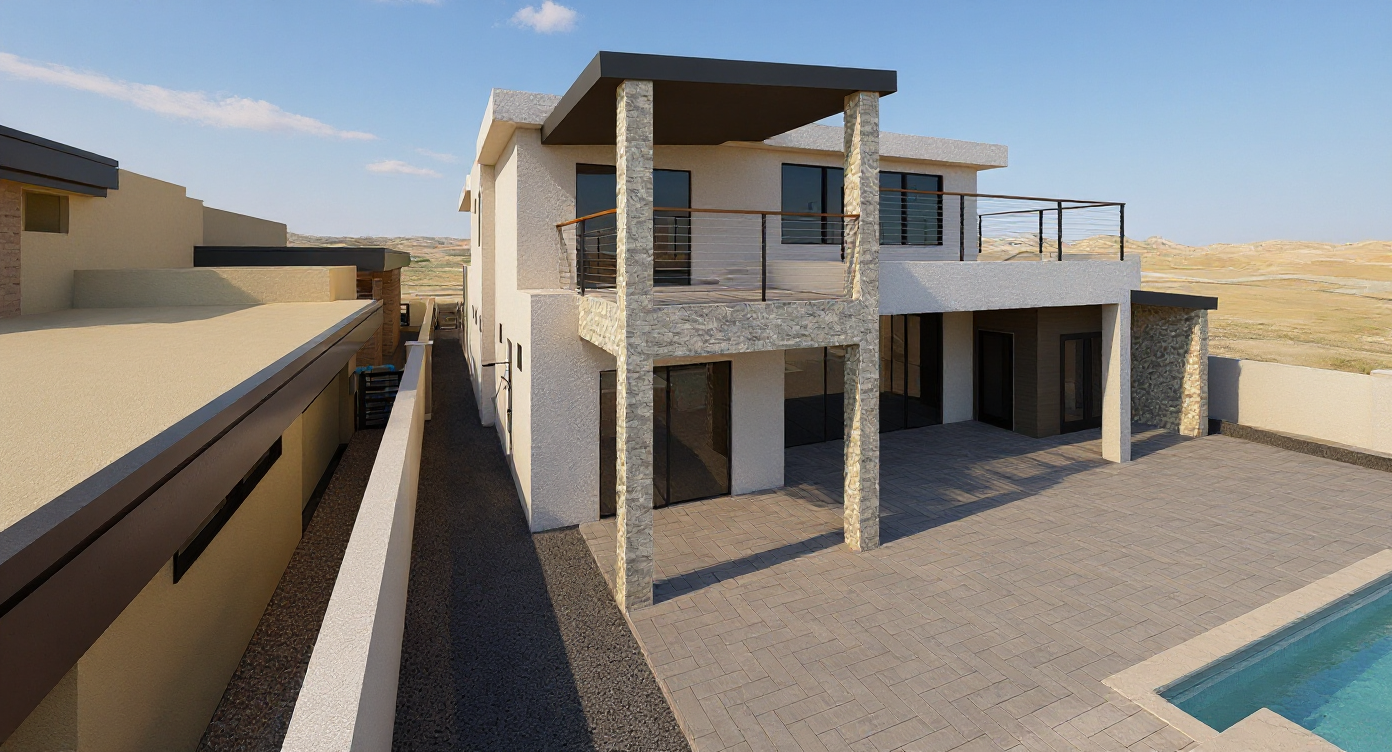 maintain all my colors the house is in the lake havasu city riviera you do have a view of the lake in this scene in the left side of the image a little bit enhance the desert to look more native keep lighting as if it is noon