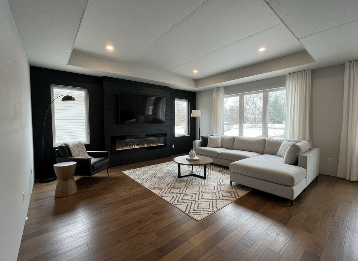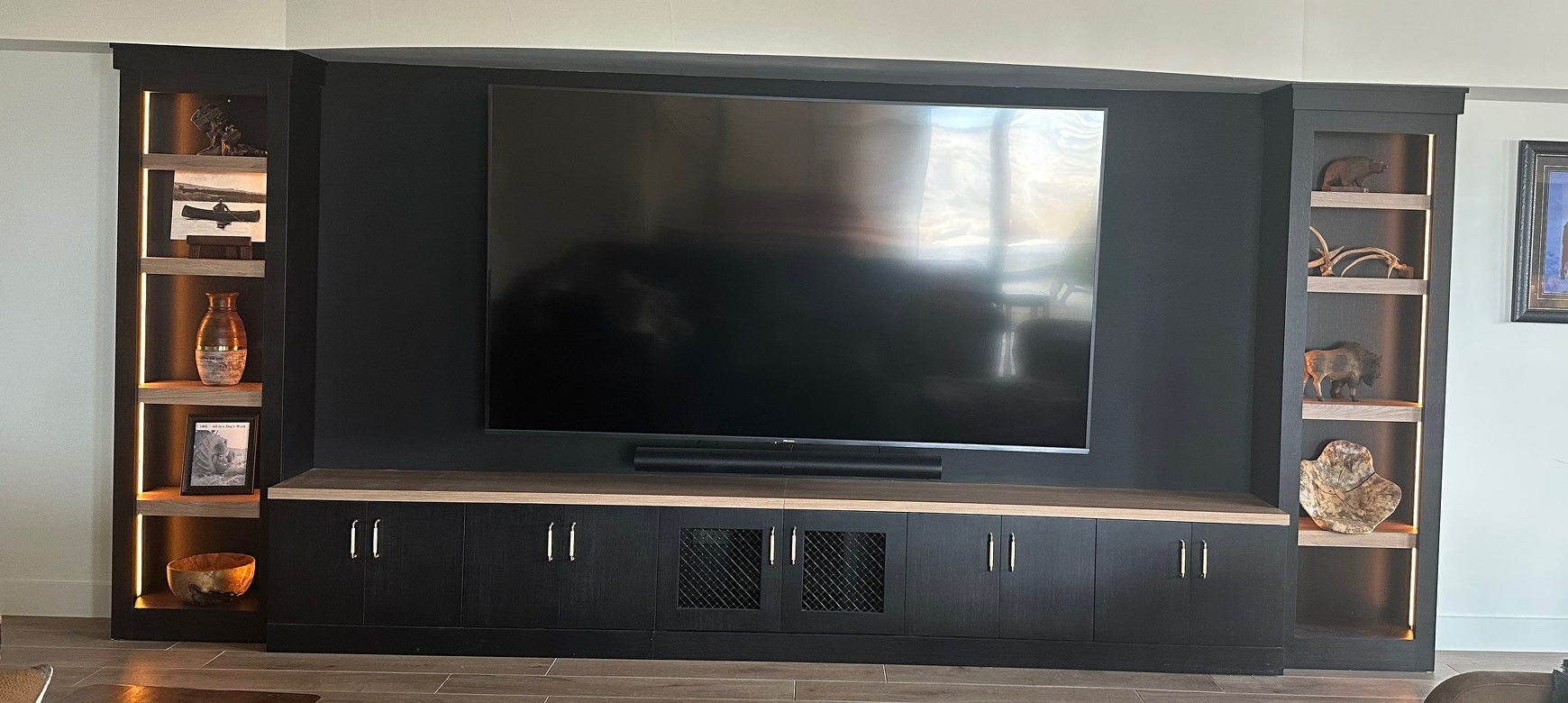 do not change the cabinets in any way preserve the exact cabinet colors materials finishes dimensions door and drawer styles hardware spacing alignment and all geometry exactly as shown do not alter the countertop shape backsplash appliances flooring lighting fixtures or wall structure only remove the construction materials clutter and mess from the scene clean the room and make it look finished and staged add a few simple tasteful home accessories appropriate for the style of the space but do not add or remove any furniture windows or architectural elements maintain the original lighting direction and realism enhance clarity and polish the photo while keeping the cabinetry and room design completely unchanged do not alter the lighting to keep the cabinet colors as they are in the image stage this as a modern entertainment space with a simple screensaver on the tv
