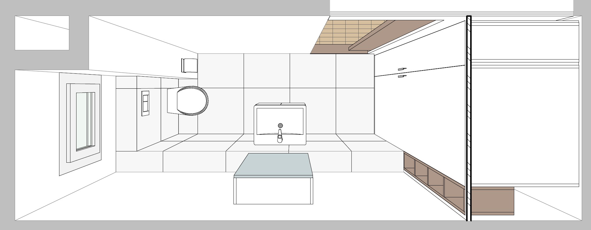 the perspective is from above a modern bathroom with a minimalist design and a serene atmosphere the walls are painted in soft white while the floor is covered with light gray tiles the sink has a glossy white finish with a silver faucet and the bathtub is a sleek matte white the cabinets and shelves are light oak wood adding warmth to the space the window lets in natural light casting gentle shadows on the floor the ceiling has subtle recessed lighting contributing to a calm and inviting ambiance the overall color scheme is a blend of white light gray and natural wood tones