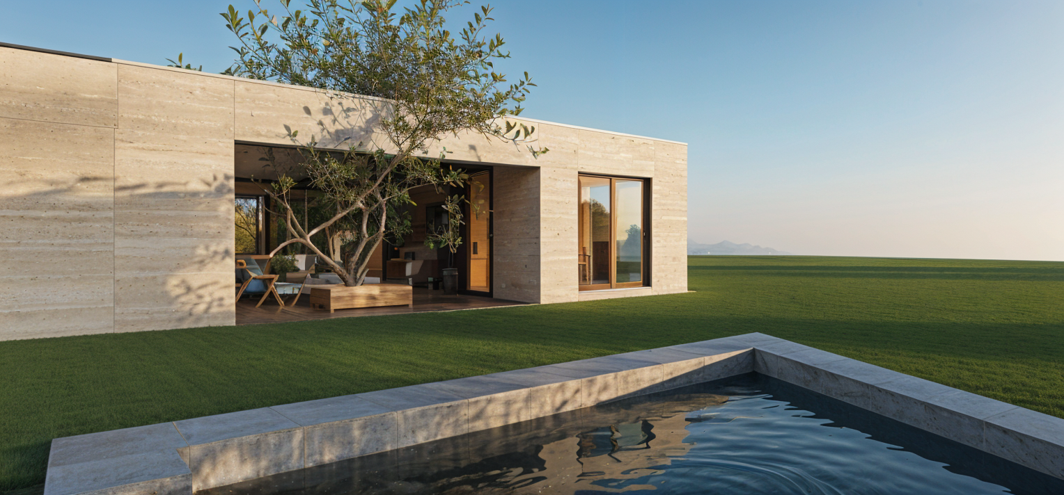 the cabinets are in a light beige solid colour the floor is light beige granite the ceiling is white the spheres are lights the settee is travertine laminate the walls are white