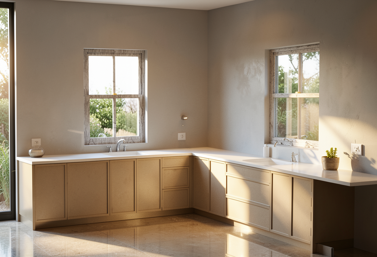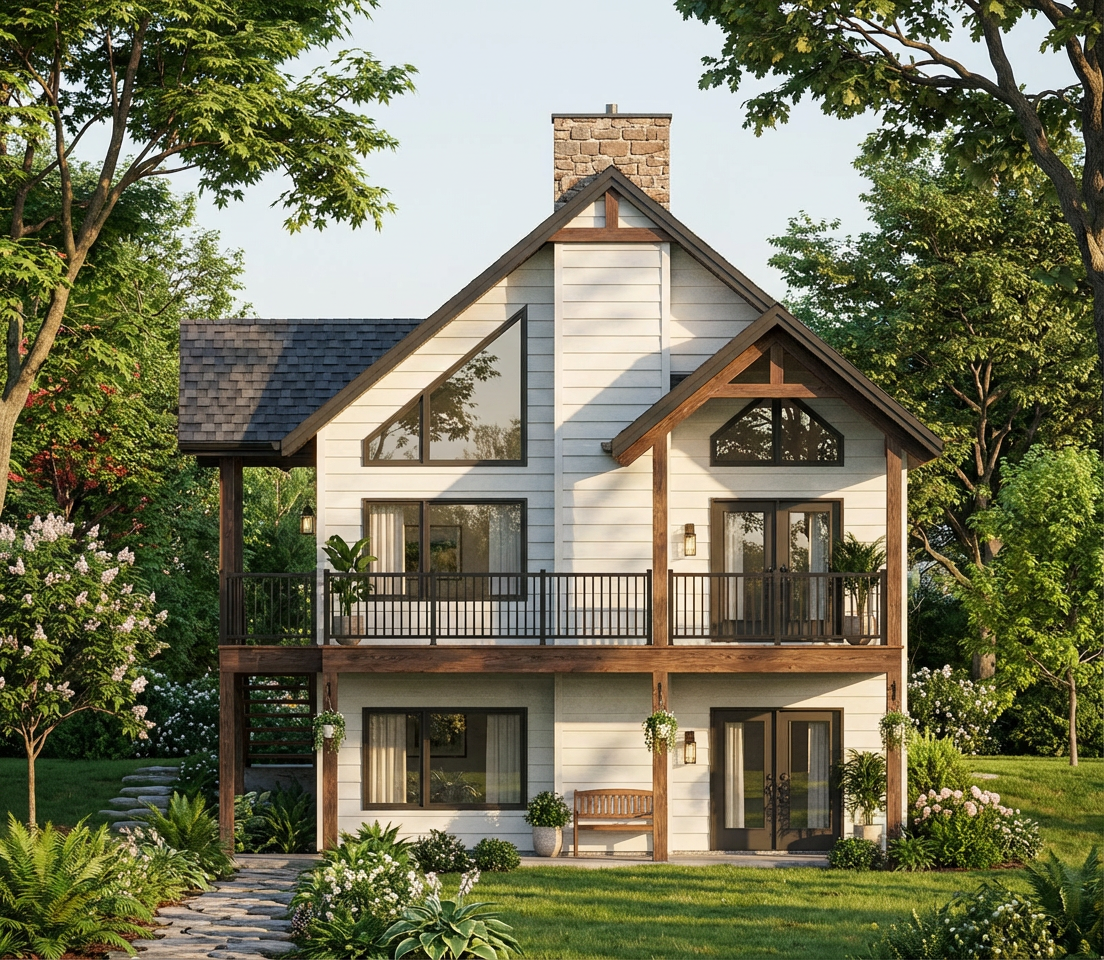 add decorations add vegetation add trees make it realistic there is a door on the left side of the house under the deck so make a pathway to the left but do not add a door
