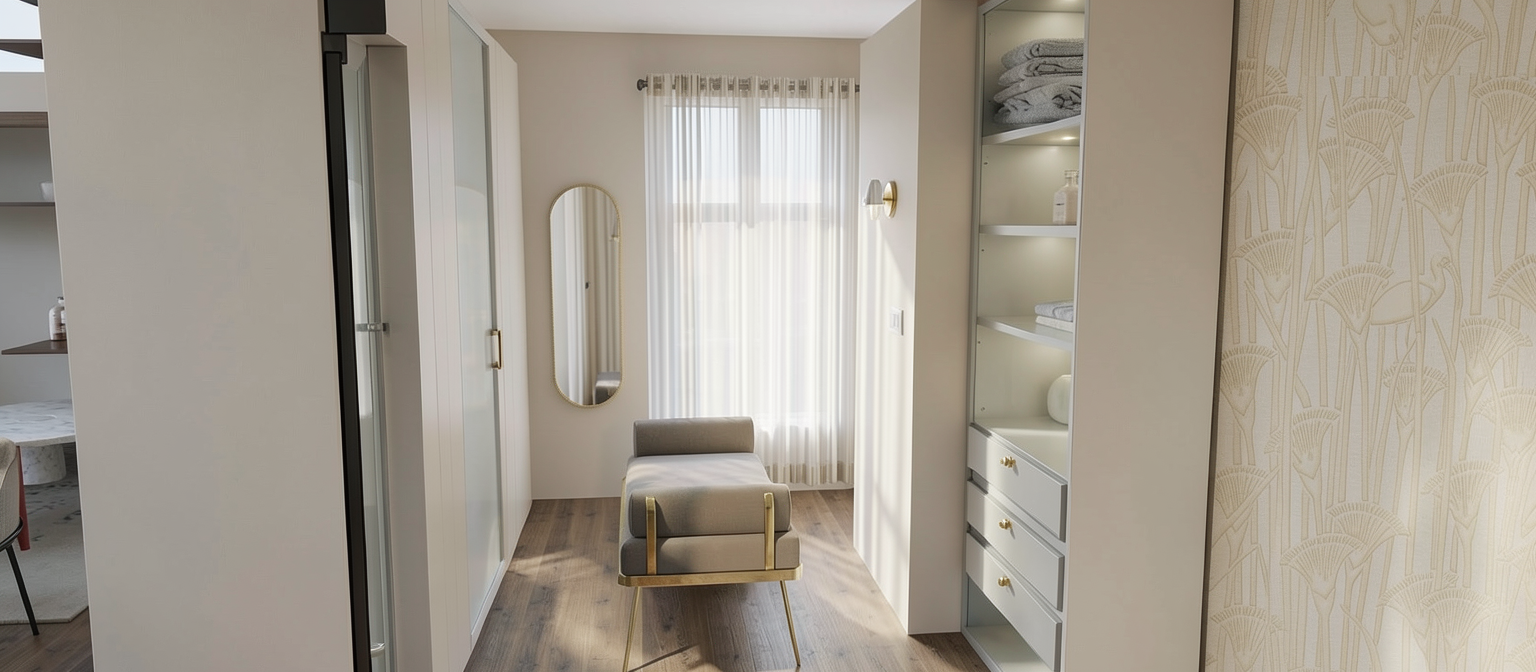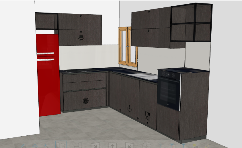 ultra photorealistic render of the exact kitchen from the reference image keep the exact layout geometry cabinets and architectural elements exactly as in the original design do not modify the furniture arrangement preserve faithfully the original materials and colors from the reference image the tall refrigerator on the left is a glossy red smeg fridge with a retro design the base cabinets and wall cabinets are dark wood with visible natural wood grain and a matte finish the wood color must remain exactly the same tone as in the original design the backsplash behind the kitchen is a smooth glass panel painted in ral 7044 grey silk grey tone with a subtle reflective surface the countertops are dark stone with a matte finish the open shelves above the refrigerator and the open shelves on the right contain decorative ceramic owl figurines in different sizes and colors natural daylight entering from the window above the sink illuminating the kitchen and creating soft natural shadows soft neutral ambient lighting inside the room designed to enhance the real colors of the materials without altering them balanced interior lighting with neutral white balance to preserve accurate color tones global illumination ray tracing realistic reflections on the glass backsplash high dynamic range lighting professional architectural photography style 35mm lens ultra detailed textures photorealistic materials accurate color rendering neutral color calibration no color shift 8k render