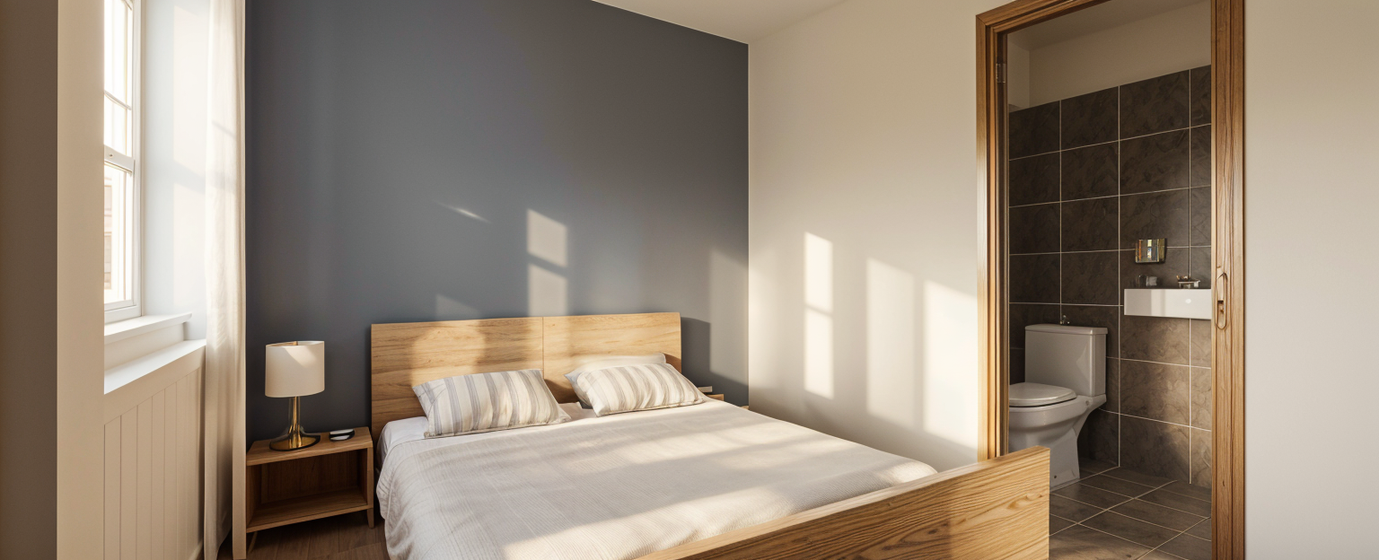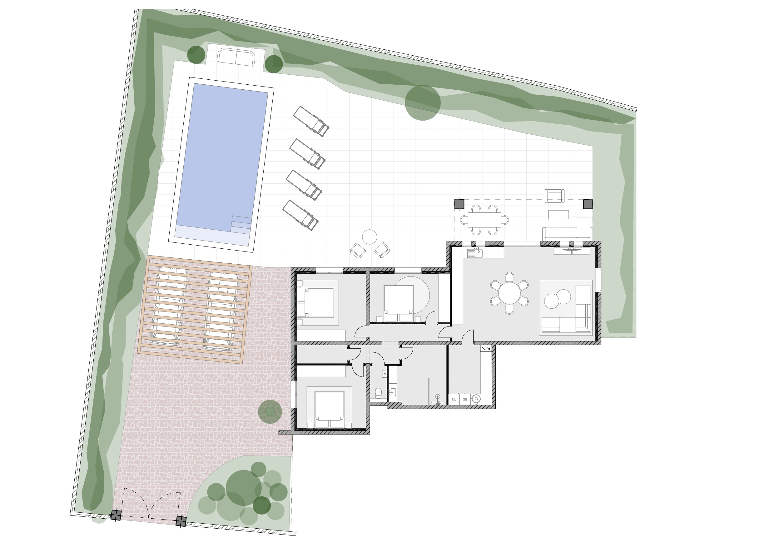 enhance this floor plan for a real estate presentation do not change the layout geometry scale walls openings or the position of any objects furniture must stay exactly in the same place but it can be visually improved to look more refined and inviting add soft architectural shading and subtle shadows to give depth use elegant line weights and a clean presentation style render the landscaping in a hand drawn style with sketch like trees soft watercolor vegetation and light ground textures use warm natural tones beige soft grey muted greens typical of high end architectural marketing plans important keep the exact plan unchanged only improve the visual style shading landscape drawing and furniture appearance add a hedge around the property and use a cream colored tile for all of the interior floors
