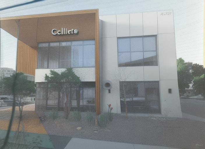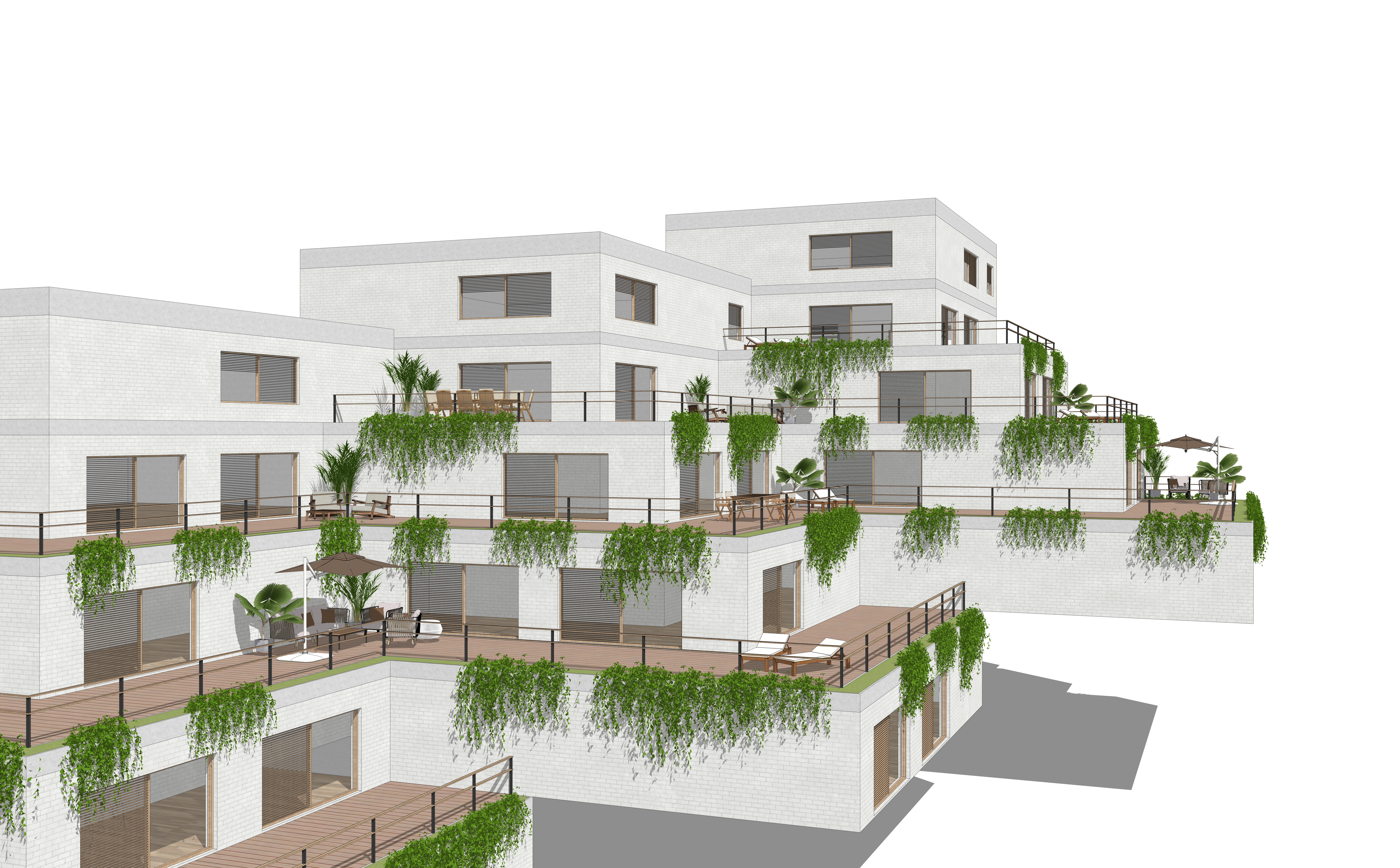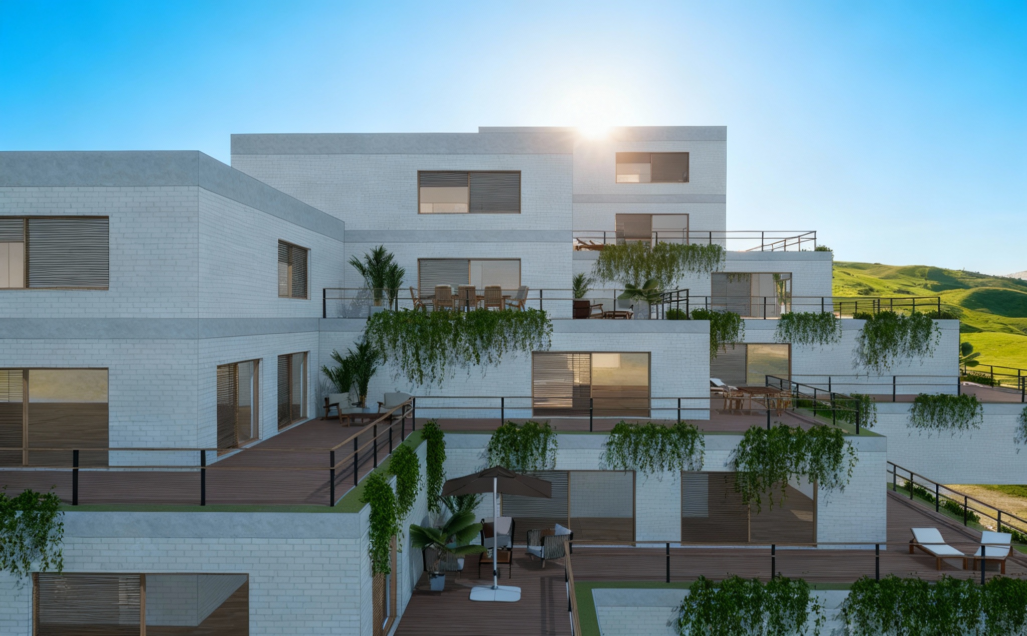 clear sky and hills in the background well lit but not overpowering clear airy calm relaxing atmosphere below building manicured greenery
