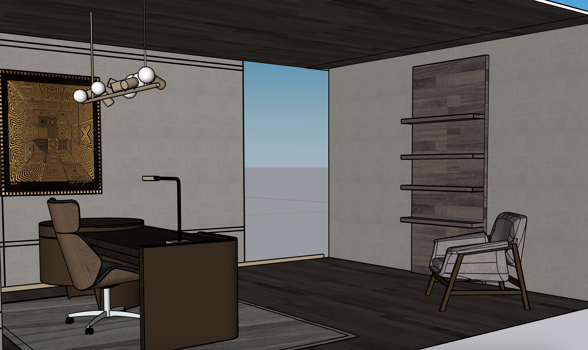 interior shot render a modern elegant office space with a sleek dark wooden desk and ergonomic brown leather chair include a contemporary pendant light with gold accents and soft white light bulbs on the wall feature an abstract artwork with intricate golden patterns on a dark background the shelves should be minimalist and dark wood the floor is polished dark wood complementing the light gray textured walls through a large window a bright blue sky is visible creating an open and airy atmosphere the scene is well lit with natural and artificial light enhancing the warm professional ambiance