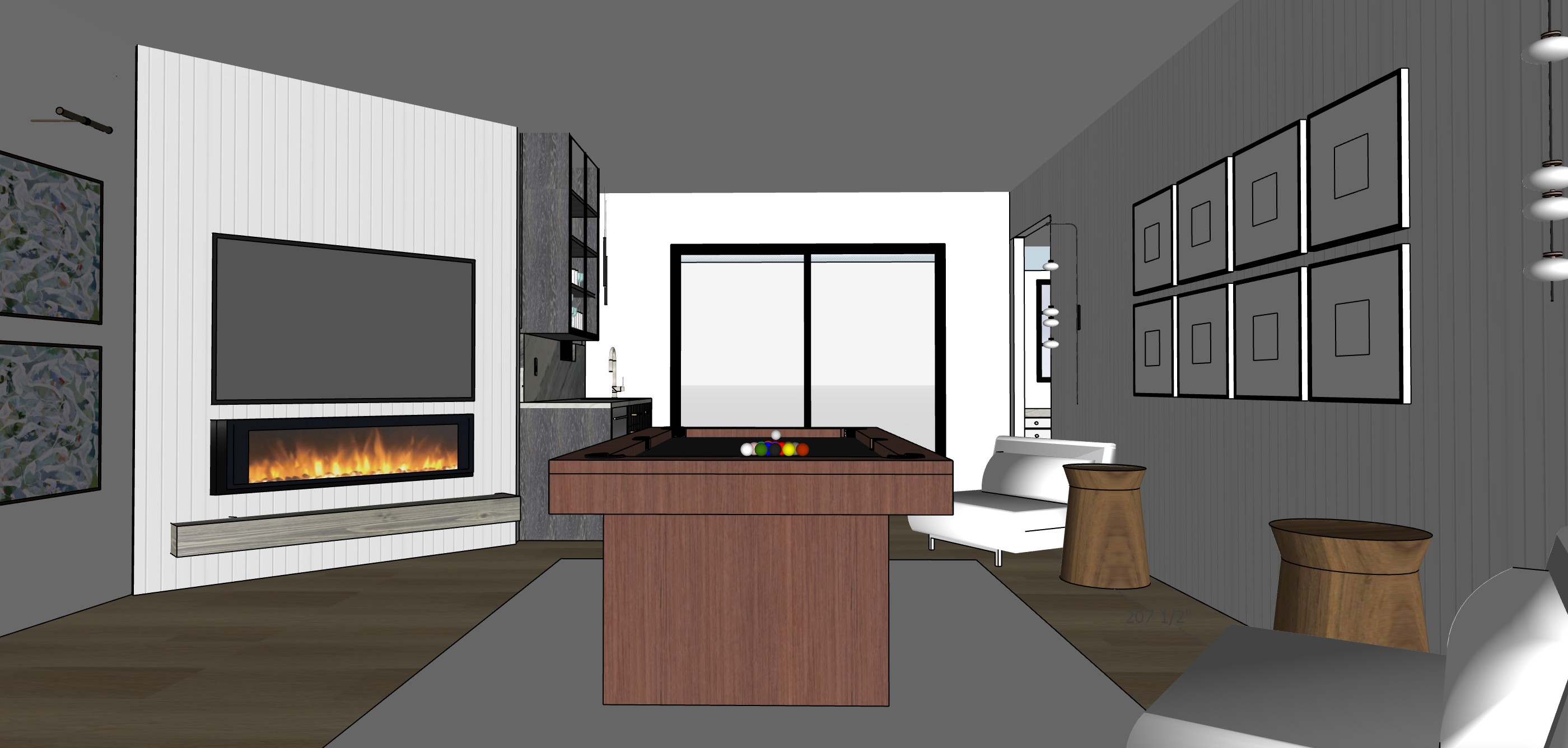 looks good but create a photorealistic rendering of this floorplan view of a downstairs living add natural textured rug keep surrounding walls painted white white shiplap on fireplace surround and long wall with art keep light oak floors remove art on floor left side show landscaping and pool outside sliders keep 2 peices of art on left wall with art light