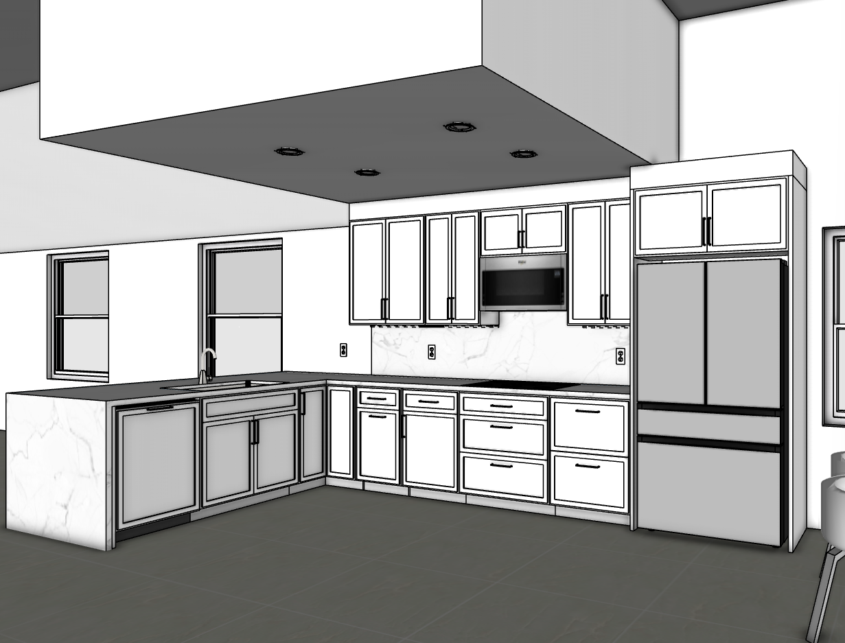 interior shot render this kitchen exactly as shown in the sketch do not change the layout proportions camera angle appliances or cabinet configuration convert it into a photorealistic render with the following specifications materials finishes cabinets panels white shaker style cabinets satin matte finish same number of doors and drawers silver handles and pulls in the exact same positions countertop backsplash calacatta quartz white with subtle soft grey veining continuous vein bookmatched from countertop to waterfall edge on the island same stone used as full height backsplash dishwasher fully integrated dishwasher with one single shaker style panel matching the surrounding cabinets toe kick z calo visible below the panel not covered sink faucet undermount stainless steel sink sleek silver faucet centered on the island appliances must remain exactly as shown in the drawing refrigerator same model flat modern french door fridge with matte steel panels and lower freezer drawers do not replace with a different model microwave stainless steel built in microwave above cooktop same model do not change flooring porcelain tile 24x24 inches light warm beige tone not pure white polished and slightly reflective lighting atmosphere natural light from windows ceiling recessed lights exactly in the same positions neutral white realistic lighting not yellow not orange shadows soft and realistic outside view keep the green landscape visible through the windows do not change cabinet quantity or size appliance models or positions ceiling structure or bulkhead window size or placement handles or hardware locations