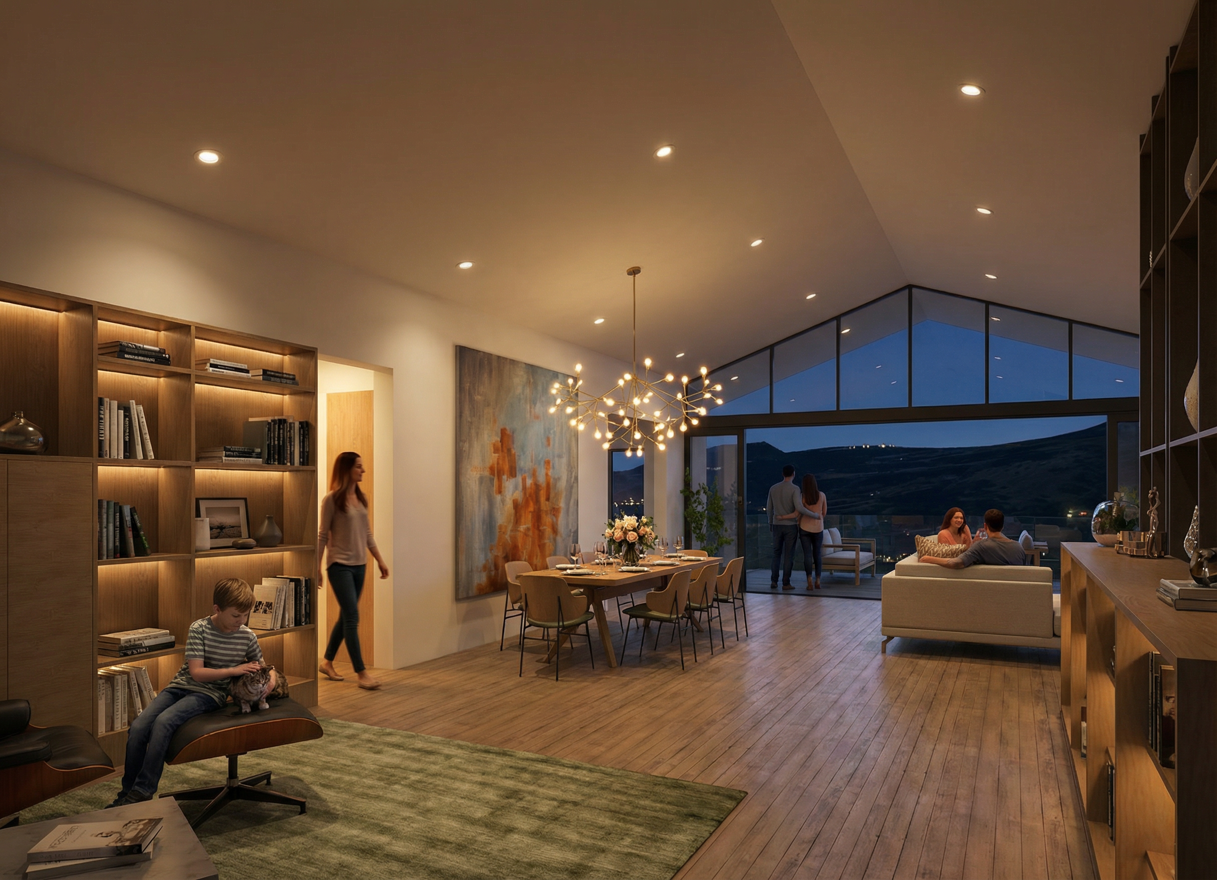 add in black track light in warm lighting to the ceiling behind fridge corridor where a partial bedroom door is seem maintain everything else in the picture do not put a track light in front of the fridge