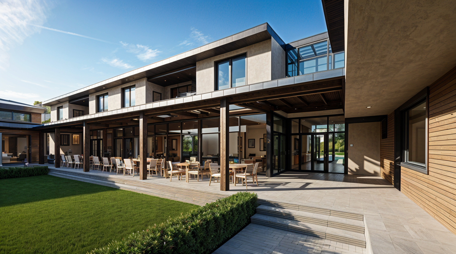 daytime rusty brown wood siding add big timber porch add american flag on flag pole in round about in front of barn