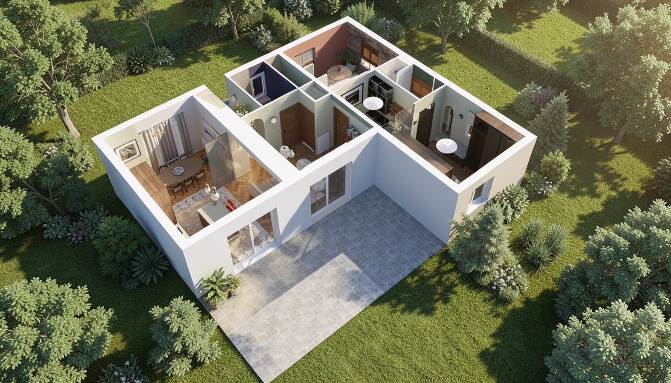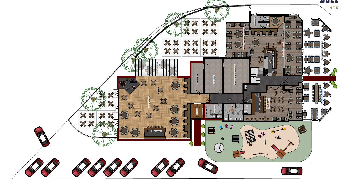 convert this floor plan of the restaurant into a realistich 3d view of a full house show the space from an elevated angle with furniture walls and details visible use the same furniture as shows on the plan do not change the orientation of the floorplan