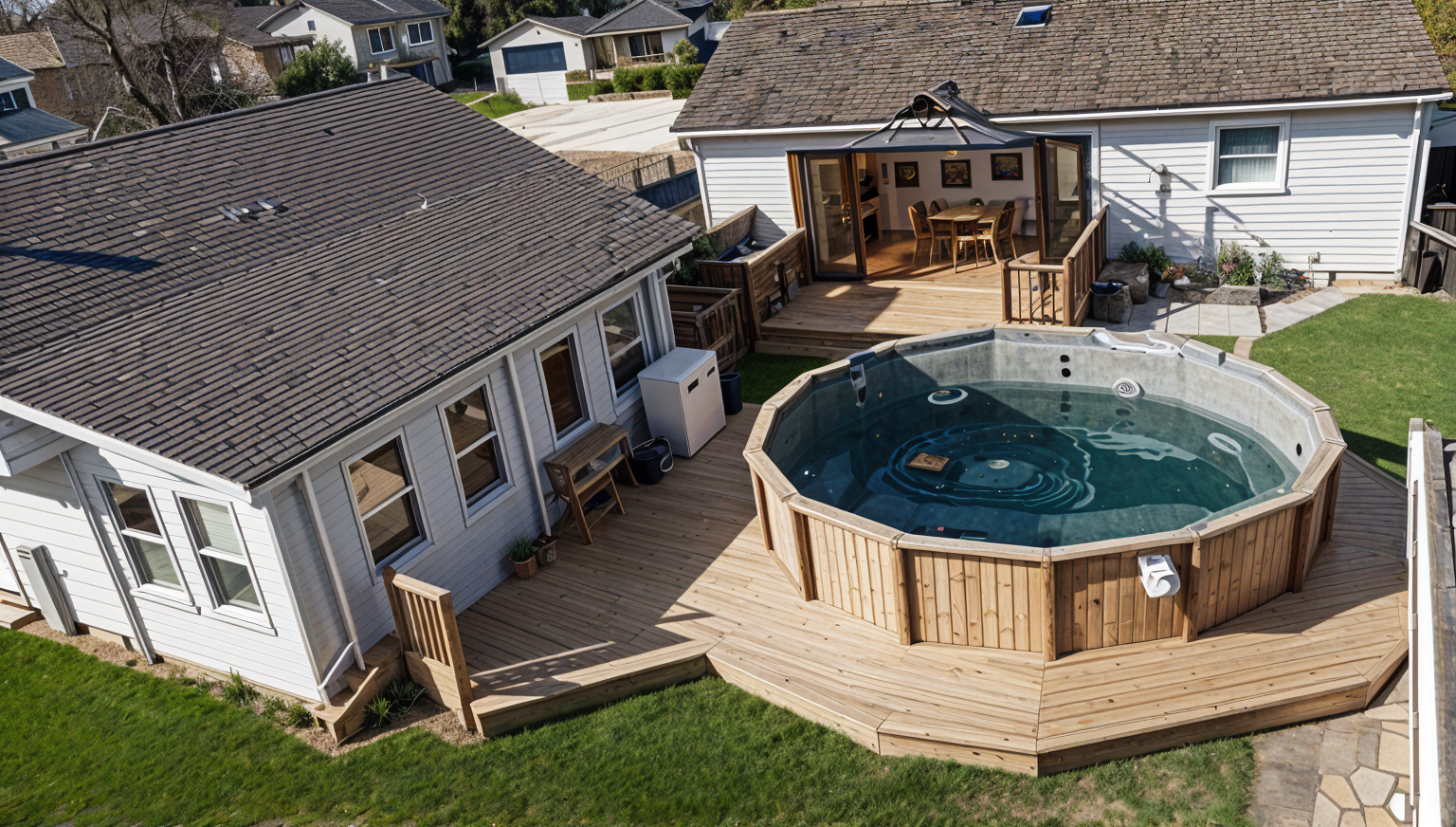 photorealistic renovation of the existing backyard keep the house pool patio and layout exactly the same size and position do not redesign or move structures build a wraparound composite deck that is level with the top of the above ground pool walls creating a flush walk on surface around the pool the deck surface must align exactly with the top edge of the pool not below it the entire deck remains one continuous level matching the height of the house door and sunroom floor no multi level deck add one set of stairs located on the left side near the house patio area leading up from ground level to the deck level add a sunroom attached to the back of the house at the same height as the deck the sunroom features large black framed folding glass exterior doors bifold doors fully open across the wall inside the sunroom include an indoor outdoor bar counter with stools facing outward toward the deck maintain realistic proportions match existing house siding and layout and keep everything consistent with the original property do not change pool size deck must be flush with pool top no deck below pool height build a wraparound composite deck fully surrounding the existing above ground pool the entire deck must remain on the same level as the current house door and existing deck no multi level deck add one set of stairs located on the left side of the pool near the house circled patio area leading up from the patio into the deck sunroom level add a sunroom attached to the back of the house at the same height as the deck and existing door the sunroom features large black framed folding glass exterior doors bifold doors fully open across the entire wall similar to modern patio folding doors inside the sunroom include an indoor outdoor bar counter with stools facing outward toward the deck similar to a pass through bar setup keep all proportions realistic match existing house siding and style and maintain original property layout clean modern residential design realistic materials photorealistic rendering do not change pool size do not move structures only one stair location at left side near house no additional stairs