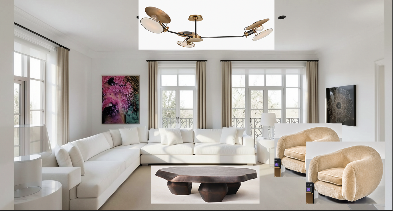 render a luxurious modern living room with an elegant and tranquil atmosphere the walls are painted in a soft warm white the large corner sectional sofa is upholstered in pristine white fabric with plush cushions the curtains crafted from luxurious beige fabric frame the expansive windows allowing soft natural light to fill the room the artwork on the walls adds a burst of color one piece features vibrant pinks and purples while the other showcases deep rich blues and blacks the carpet is a light beige complementing the room s neutral palette use contemporary materials like glass and metal accents for the tables and modern light fixtures on the ceiling the overall mood is calm sophisticated and welcoming