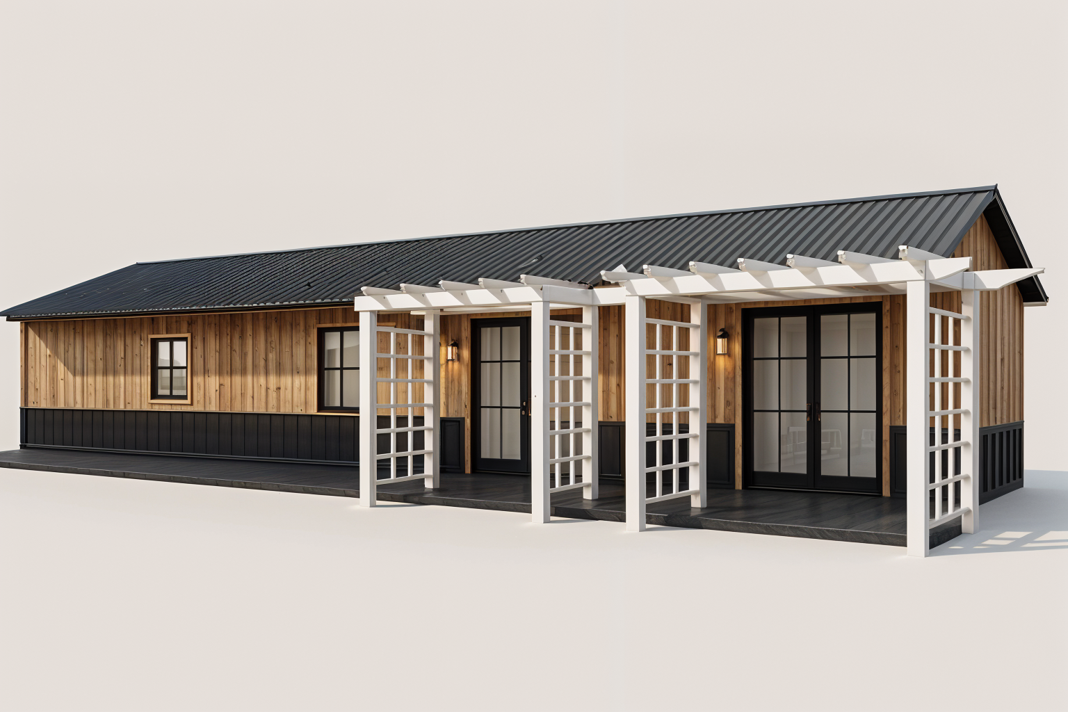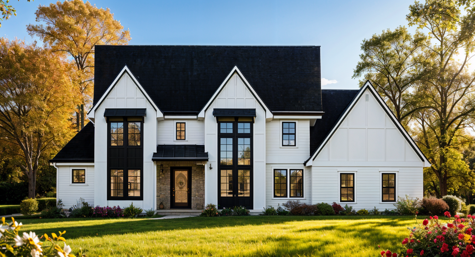 generate a high quality photorealistic render modernist exterior shot visualize a modern residential building with a contemporary design the building should have white exterior with black accents and black roof large windows with reflective glass and the atmosphere should be light and airy with clear blue skies and soft sunlight casting soft shadows from the front the surrounding landscape should include lush green grass colorful flowering shrubs and tall deciduous trees with autumn colored leaves architecture