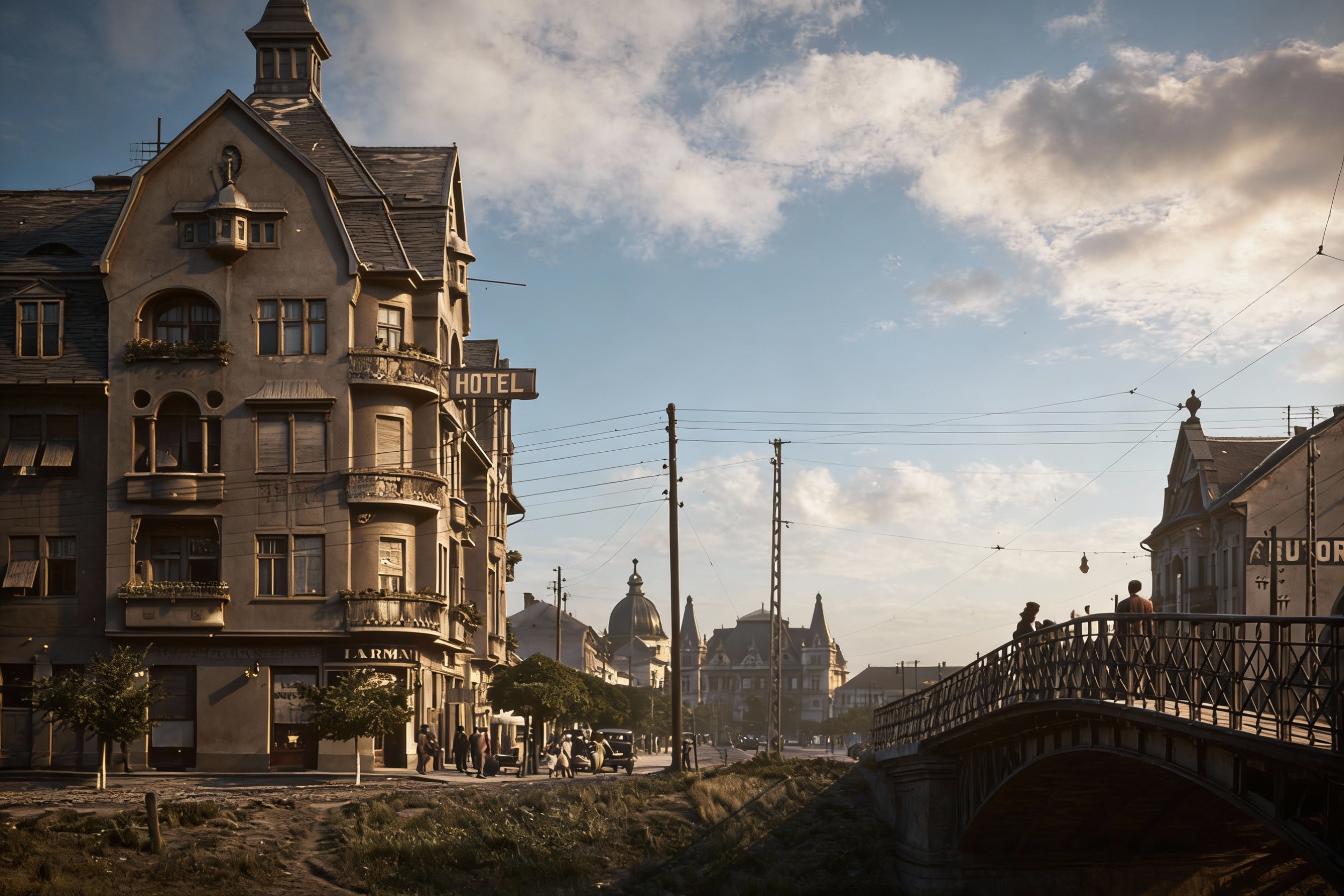 sunny summer day 1900 s style atmosphere beautyful clouds clear high picture exposure stucco facade with light colors enhanced details color cinematic hyperrealistic view