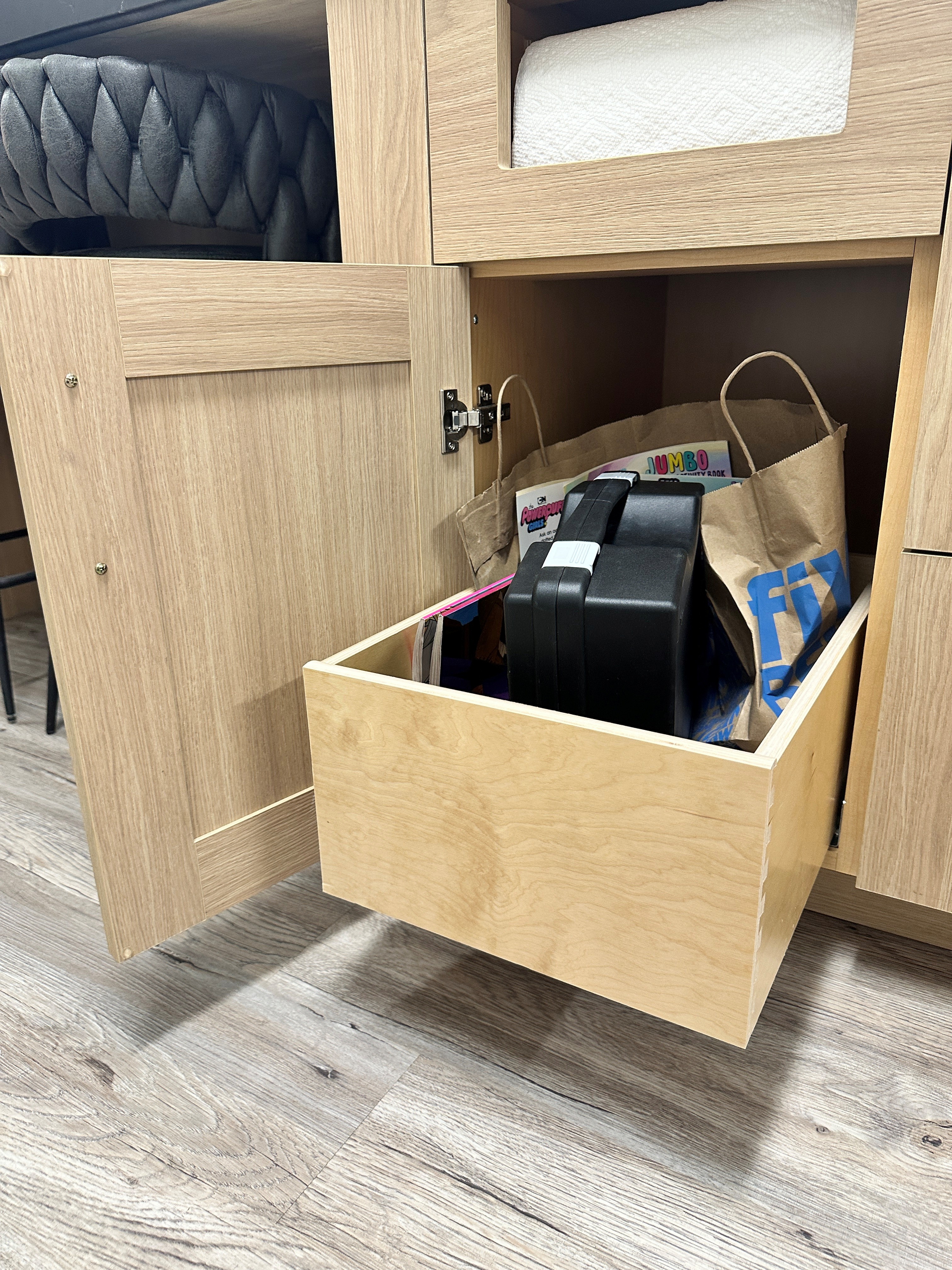 add natural light make the floor a light hardwood restage the drawer with kitchen cleaning supplies that look nice change the floor to a light hardwood color