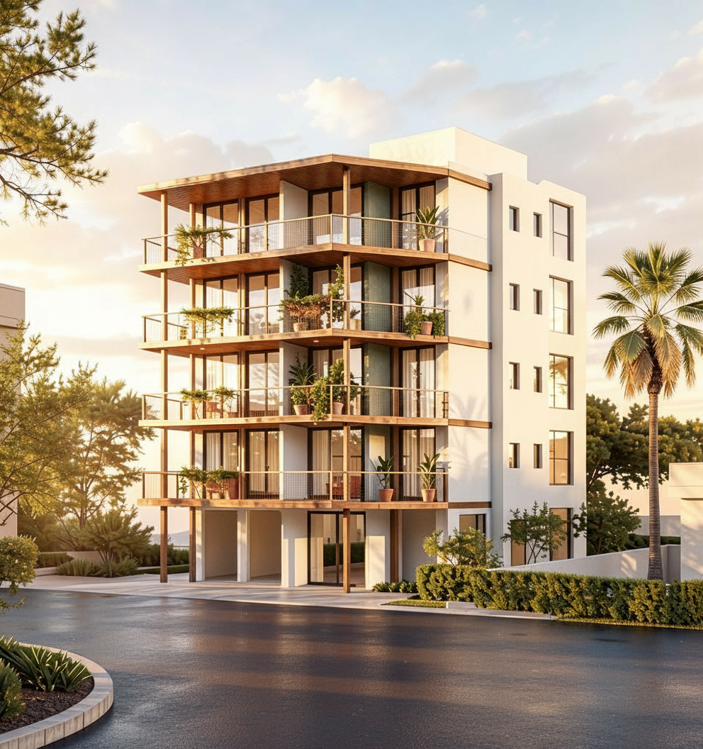 exterior shot photorealistic architectural render of the rear elevation of the same modern apartment building shown in the reference image the building is a 5 storey residential renovation with a central recessed section containing stacked balconies the balcony slabs are lightweight metal extensions identical to the front verandas with slim steel structure and glass railings matching the design language of the front fa ade across the recessed balcony zone there is a powder coated metal mesh screen painted the same warm white color as the building fa ade creating a semi transparent architectural screen while allowing ventilation and light the fa ade is smooth white stucco with dark aluminium window frames minimal contemporary detailing ground floor with open pilotis columns and parking beneath the building environment with tropical landscaping palm trees clean paved driveway soft shadows golden hour lighting warm sunset atmosphere cinematic architectural visualization ultra realistic materials global illumination highly detailed professional v ray style architectural render 8k quality camera rear three quarter perspective showing the recessed balconies and full height of the building architectural photography with corrected vertical lines