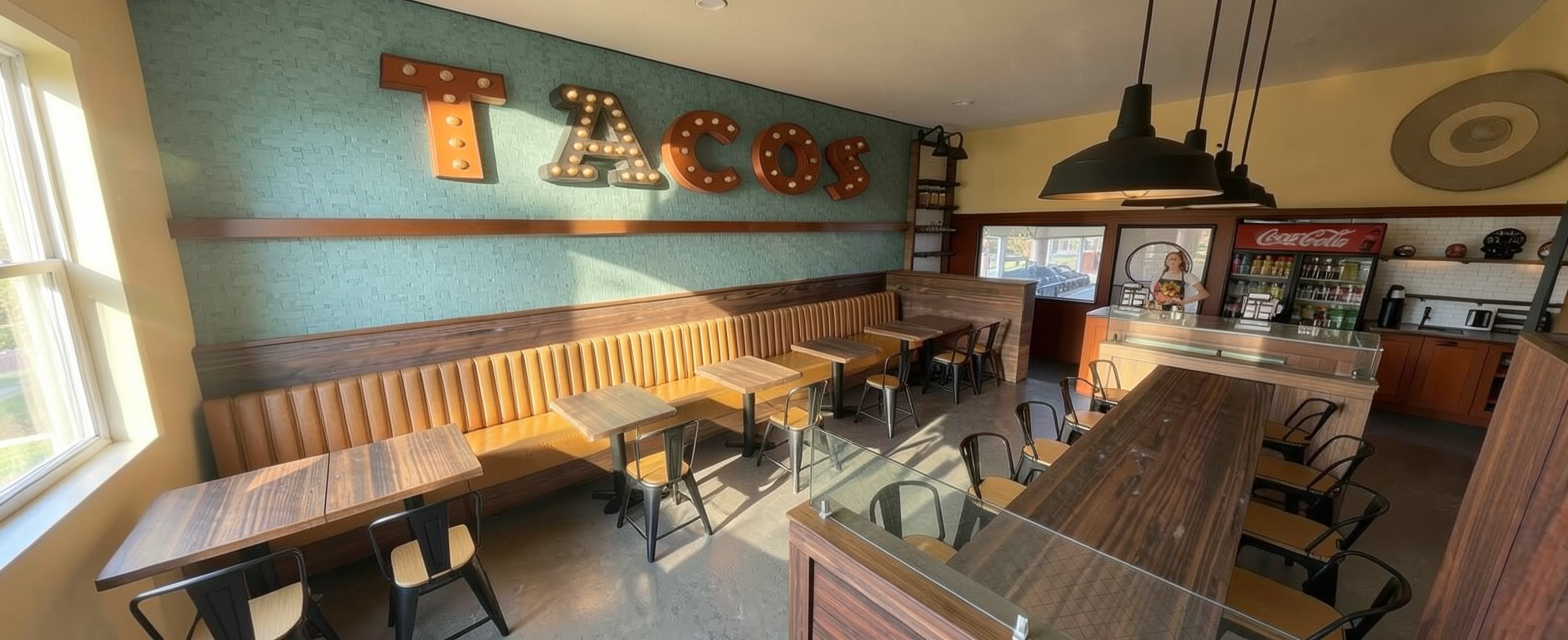 la iluminacion natural suave entra desde la ventana que esta al lado izquierdo de la palabra tacos y que va desde el piso hasta el techo y esta ubicado en katy texas