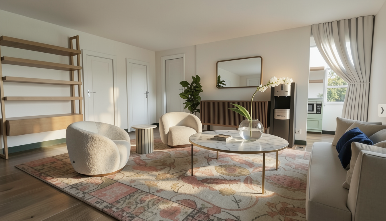 a dark immersive stage environment with an oversized suspended led screens black void around perimeter add business people in smart casual work clothing in the audience