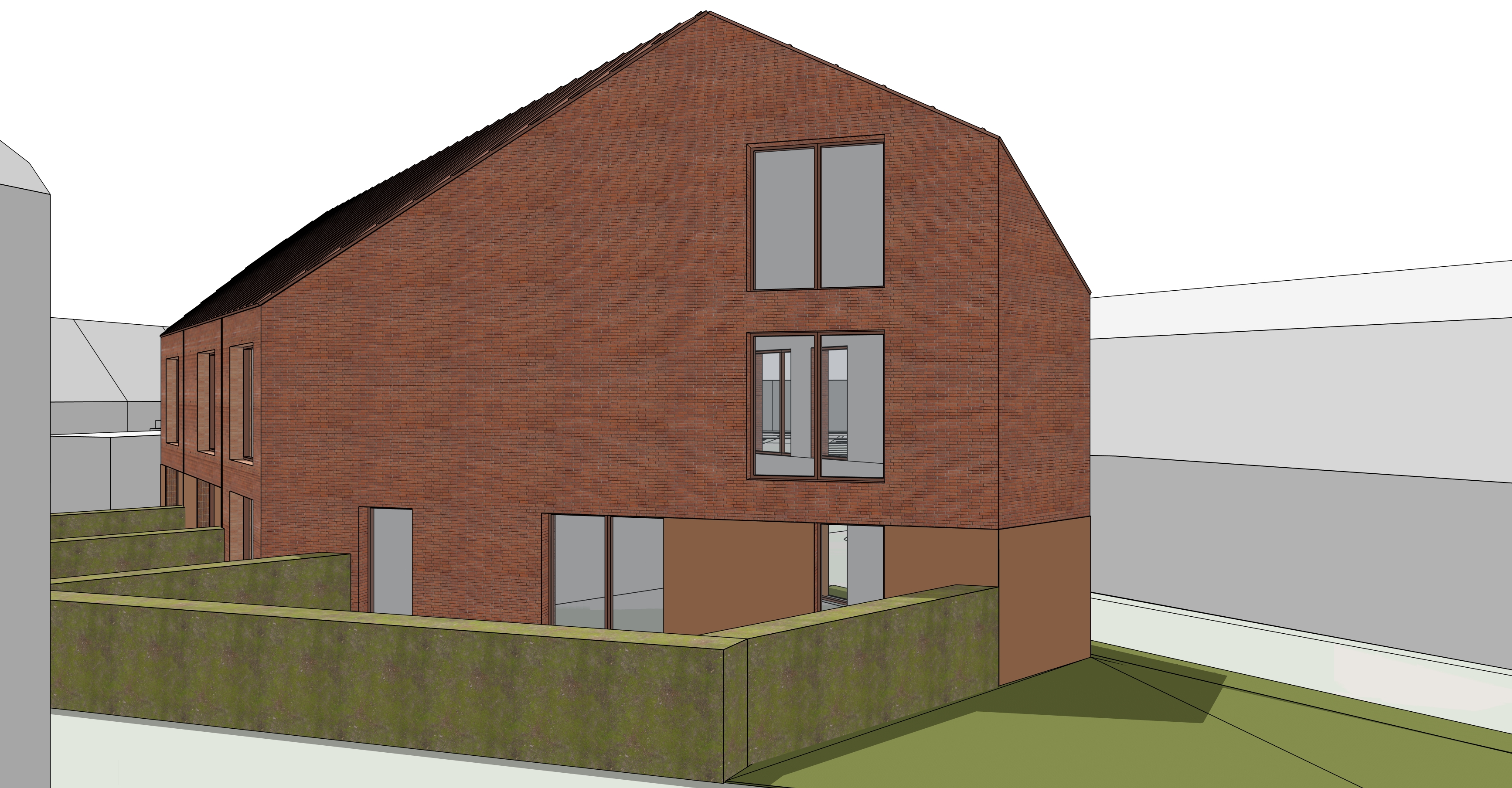 create a warm and inviting residential courtyard scene inspired by contemporary dutch architecture the main buildings should feature fa ades made of red brown mottled brick and window frames in an orange red brown tone the roof detailing must consist of vertical red brown panels with a matte weathered texture adjacent buildings may appear more abstract while still maintaining a sense of neighborhood cohesion these should be entirely bright white with glass creating a strong visual contrast with the brick buildings between the sidewalk and the bottom edge of the ground floor window frames include a trasraam plinth made of pigmented concrete in the same color as the window frames depict an autumn like day in the netherlands with soft slightly diffused daylight and gentle warm tones on the right side of the scene place a green tree with autumn foliage in front of the buildings and add an area of grass with flowers in front of the building on the left side of the street in front of the last building include another tree add a pedestrian sidewalk and use traditional dutch style brick pavers for the street surface incorporate subtle landscaping throughout and include a few people walking or cycling to create a calm community oriented atmosphere