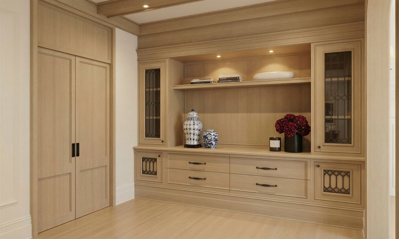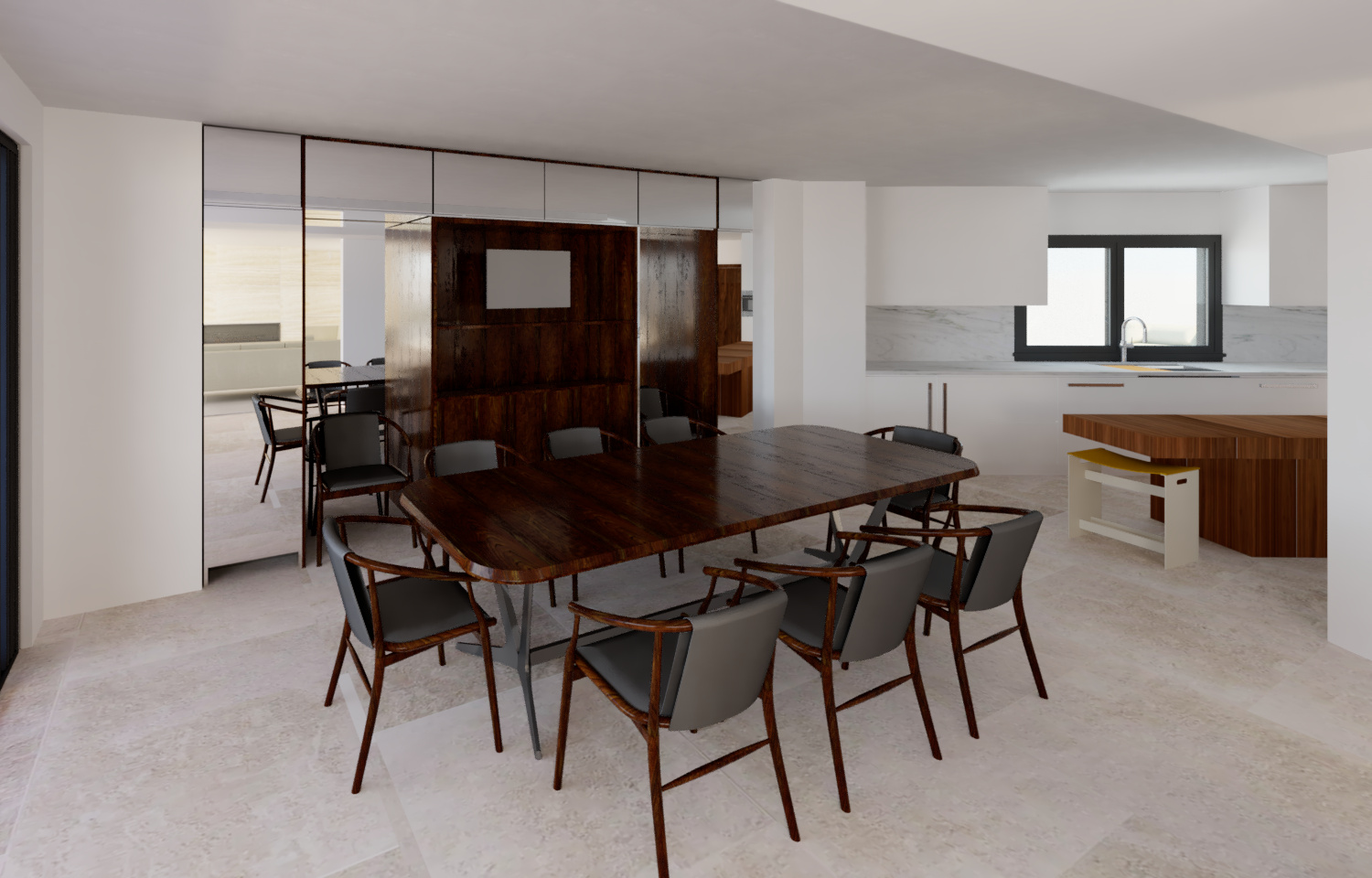 a modern dining room and kitchen with a sophisticated minimalist design the room features a long polished dark walnut dining table with elegant matching wooden chairs upholstered in soft charcoal leather the smooth light beige limestone floor complements the crisp ivory walls enhancing the spaciousness of the room the kitchen area includes sleek white marble countertops and an island table with rich walnut accents black window frames add a touch of contrast to the otherwise neutral palette the atmosphere is warm inviting and serene with soft natural lighting streaming through the windows casting gentle shadows and creating a calm and inviting ambiance