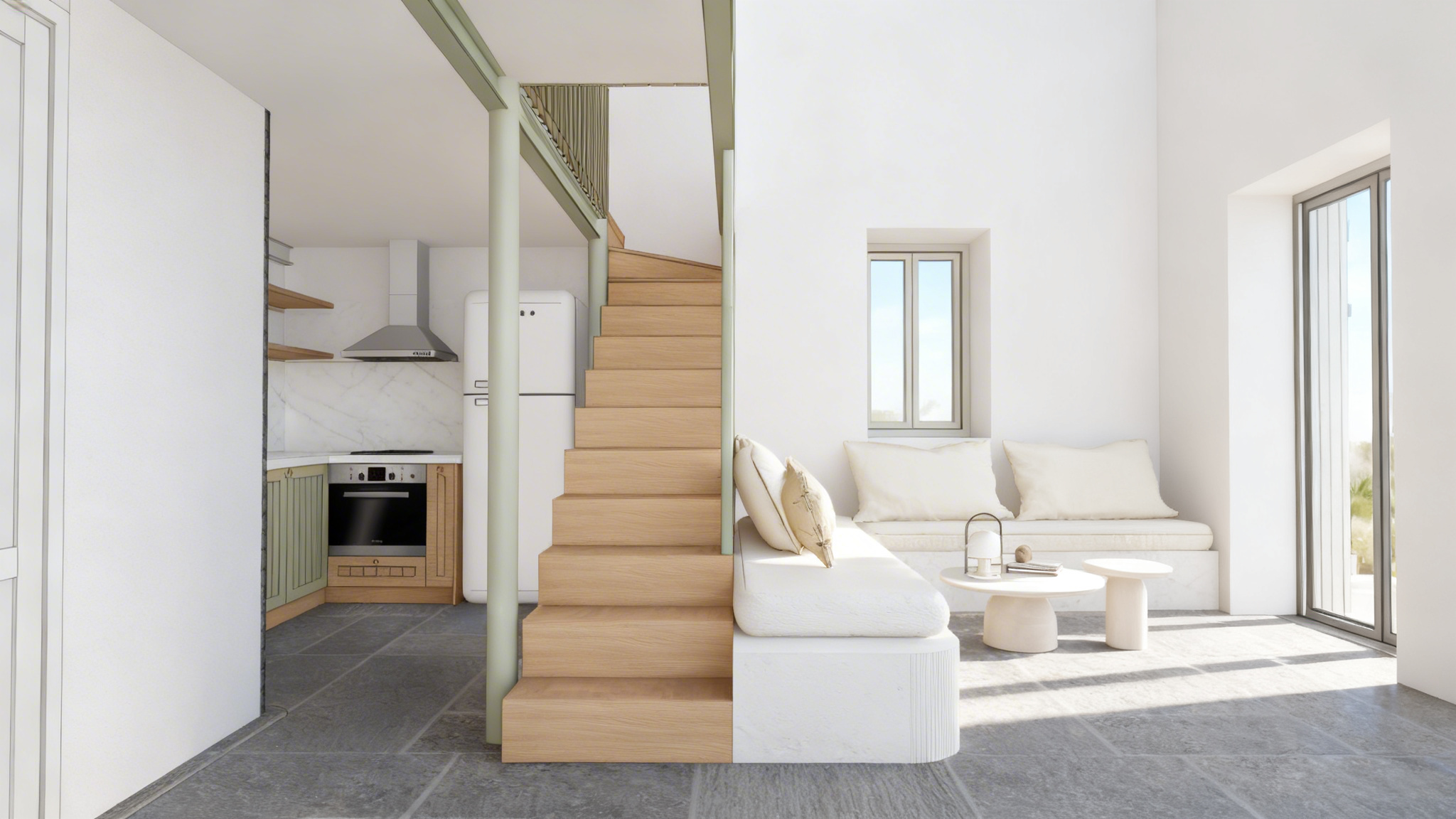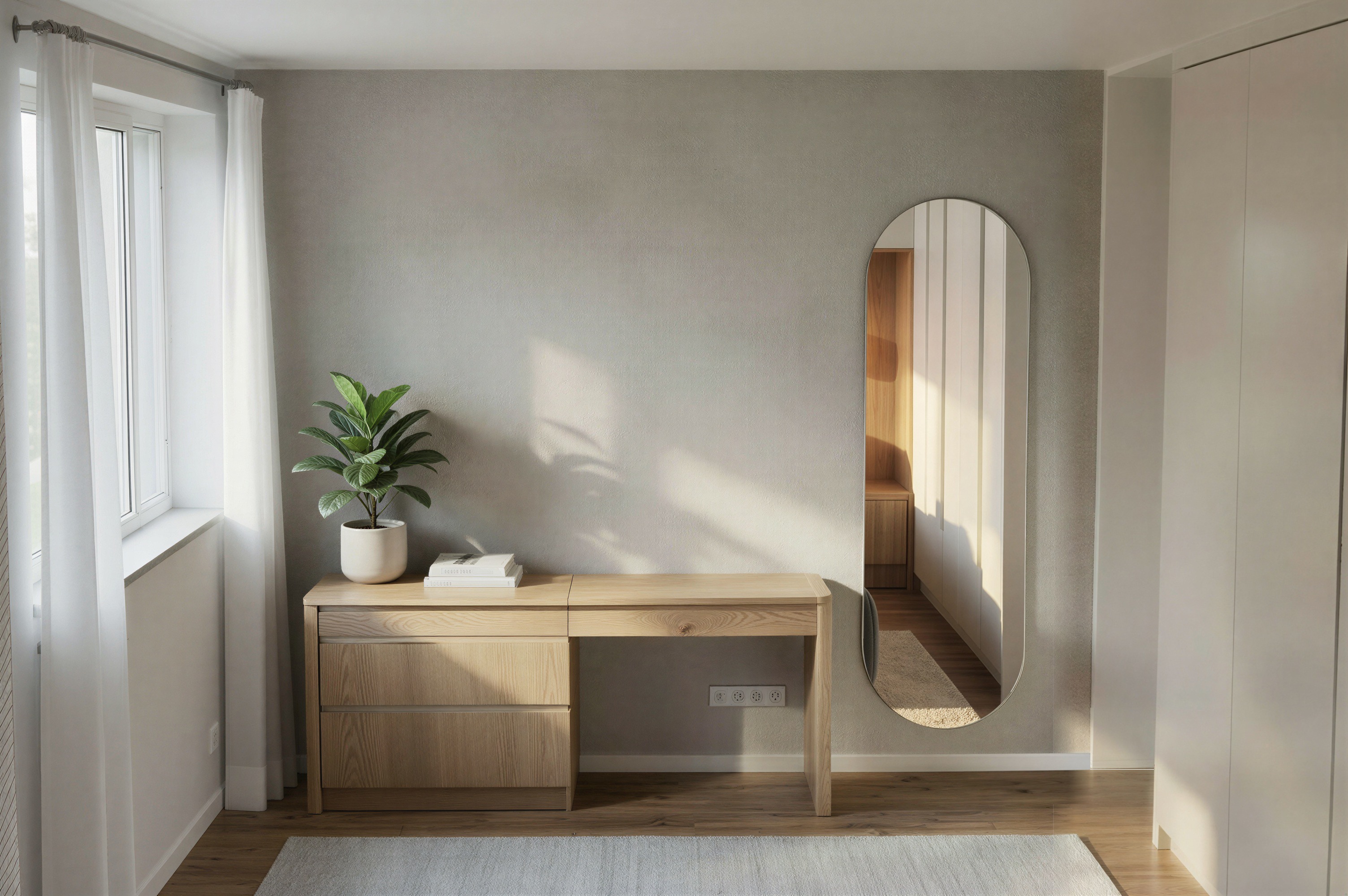 ad light beige decorative wall plaster smooth matte surface with subtle cloudy variations soft concrete like texture fine irregular tonal transitions slightly mottled appearance delicate hand troweled effect minimal roughness no cracks no sharp patterns natural diffuse lighting warm neutral tones elegant modern interior finish micro texture visible but very soft seamless wall surface change the mirror reflection to be more realistic