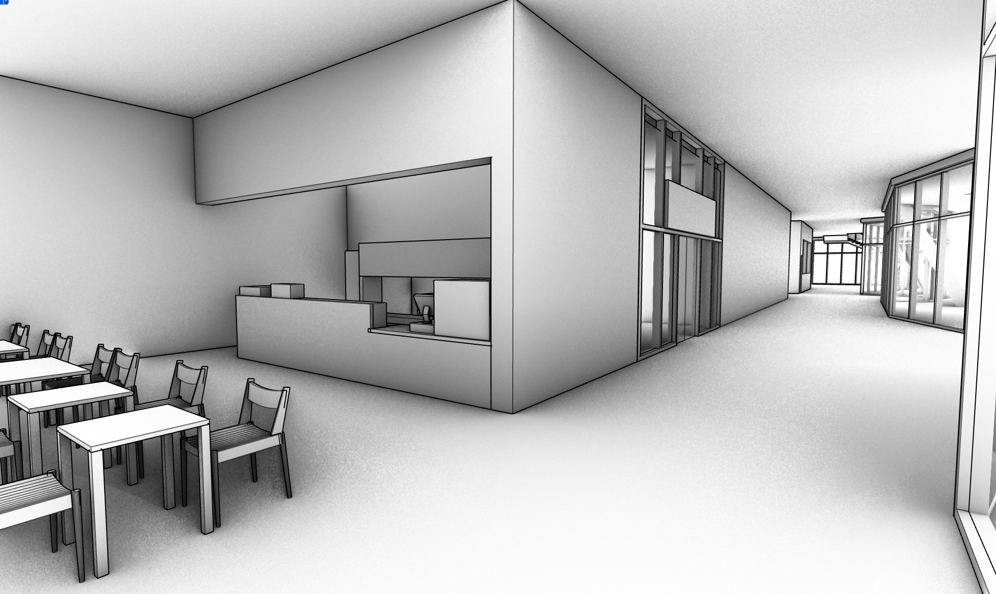 keep all geometry exactly as modeled including the counter layout wall openings seating arrangement glass partitions and corridor proportions do not add or remove any geometry use smooth warm concrete for the walls and ceiling with a subtle beige tint that matches the building s interior palette apply warm ceramic tile flooring with soft veining throughout the interior circulation areas including the caf and gift shop zone render the window frames mullions and metal supports with a beige matte aluminum finish do not allow concrete or wood on the frames they must remain metal with a clean satin surface make the glass clearly visible with soft reflections and slight transparency ensure the glazing is realistic and not invisible for the caf tables and chairs use simple light wood with a matte finish keeping them clean and minimal without added decoration preserve their exact shape as modeled do not change their geometry use bright warm daylight entering from the glass storefronts and corridor windows to create a clean museum like environment avoid dark corners or strong shadows do not add any extra objects products signage food items or decorations inside the caf or gift shop keep the space minimal and architectural the overall atmosphere should match the rest of the project warm clean soft contemporary and calm