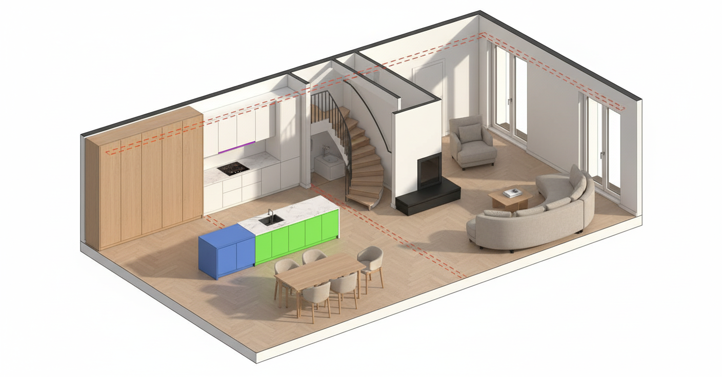 genau dieses rendering berarbeiten fotorealistisches innenraum foto exakt dieselbe perspektive und kameraposition wie das hochgeladene referenzbild links beim fenster sch ne moderne topfpflanze rechts hinten ist die dusche auf der linken seite einen treppe bers eck mit indirekter beleuchtung auf das podest beim fenster wanne vorne ist dann etwa 1 20 mal 1 20 gross und 30 zentimeter h her als das podest beim fenster hinten sehr h bsche asiatische frau um 25 im tauchbecken 100 identische raumgeometrie weiches nat rliches tageslicht mit schatten von jalousien an den w nden vollfl chige horizontale jalousien ausserhalb der fenster alles beige ist homogener hellbeiger kalkstein visso montenegro platten 80x40 cm links gibt es einen transparenten beigen vorhang beim fenster links ebenfalls ein raumhoher vorhang rechts hinter der wanne ein modernes bild an der wand am boden steht auf der linken seite eine grosse moderne topfpflanze alle anderen w nde sind weissputz ral 9016 raum zus tzlich k nstlich ausleuchten sanfte realistische schatten realistische materialien hochwertige oberfl chenreflexionen nat rliche farbwiedergabe golden hour feeling hell ausleuchten das bild muss wie eine professionelle fotografie aussehen es soll ein echtes und reales foto sein canon eos r5 35 mm festbrennweite f 2 8 hyperrealistisch dslr qualit t raw aufnahme 8k aufl sung extrem scharf perfekte tiefensch rfe professionelle architekturfotografie