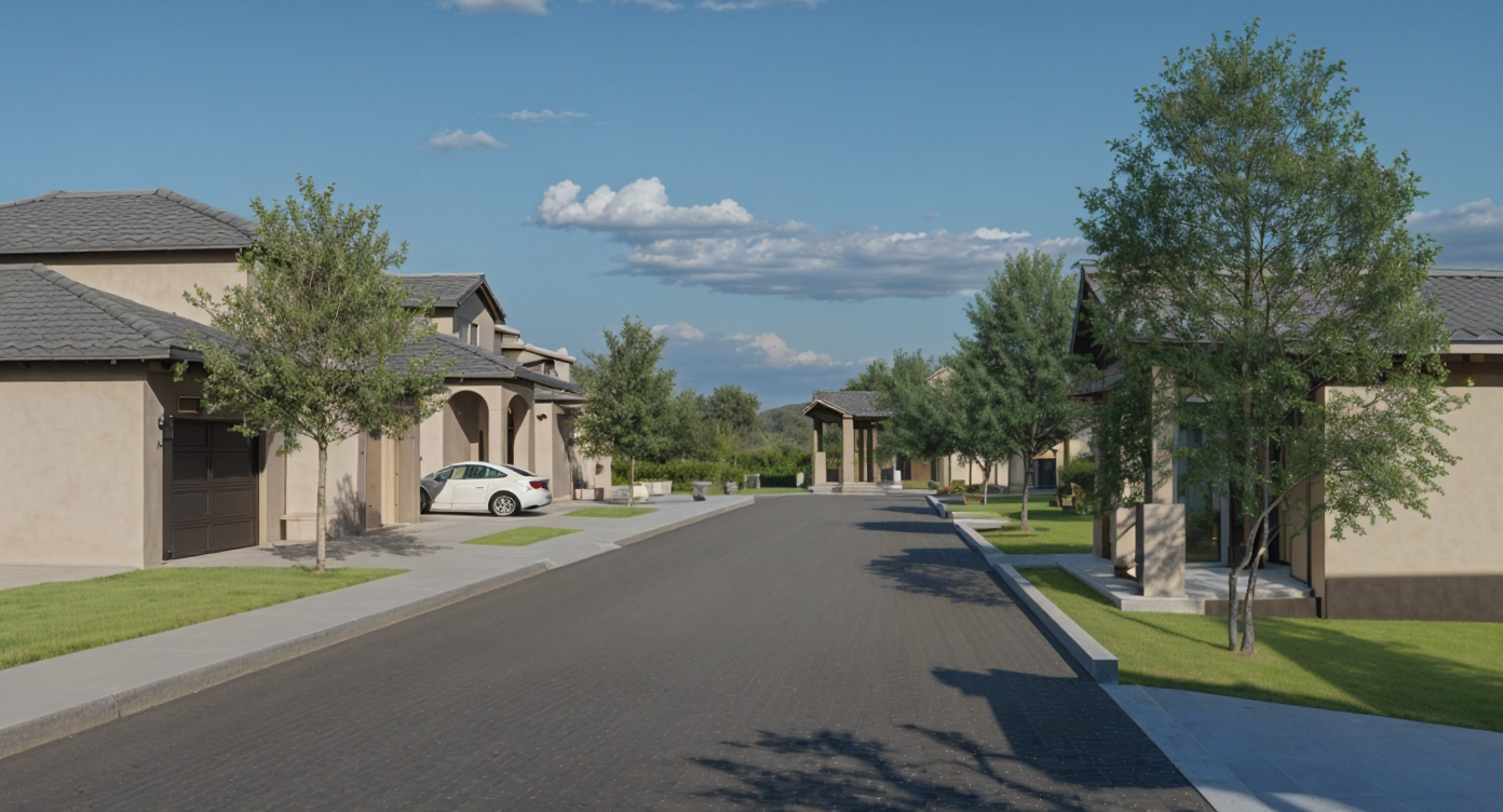 enhance the scene with have photorealistic materials and keeping the original colors the atmosphere should be serene and inviting with a bright blue sky filled with soft fluffy clouds add low lying landscape native shrubs in green areas