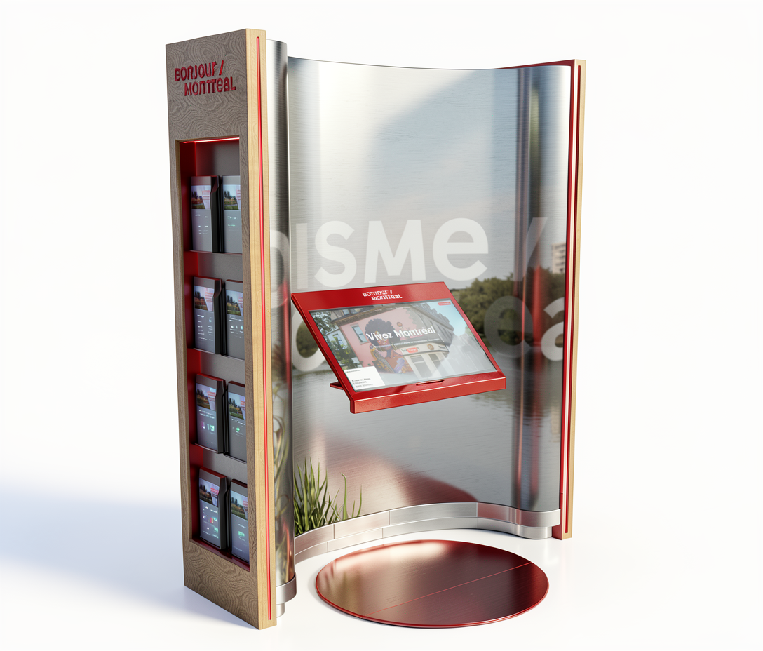 ultra realistic architectural render of my original 3d model strictly preserving the exact geometry proportions and design no redesign or reinterpretation only photorealistic rendering of the existing model materials matte light natural wood finish with subtle and minimal wood grain brushed stainless steel metal with realistic reflections and accurate roughness glossy red lacquered metal structural elements screens and light emission the large curved background surface is a matte led display screen showing an image emitting a soft and subtle light the touch screen embedded in the red lacquered metal brace is a luminous display and emits a gentle glow digital screens should appear realistic with soft light emission and minimal reflections led accents thin red led accent lighting integrated along architectural edges on both sides of the structure additional red led inserts along the base foot kick red led accents integrated around the edges of the brochure holders leds should appear as thin glowing lines with controlled brightness and soft light spill floor detail the circular graphic on the floor is a heavy duty matte vinyl sticker applied to the surface lighting soft natural lighting with directional sunlight realistic shadows global illumination and subtle ambient bounce light clean professional studio lighting environment environment crisp white background emphasizing the architectural object product style presentation with cinematic composition quality high end architectural visualization style ultra detailed photorealistic 8k render quality ray traced lighting global illumination physically accurate materials professional archviz studio rendering