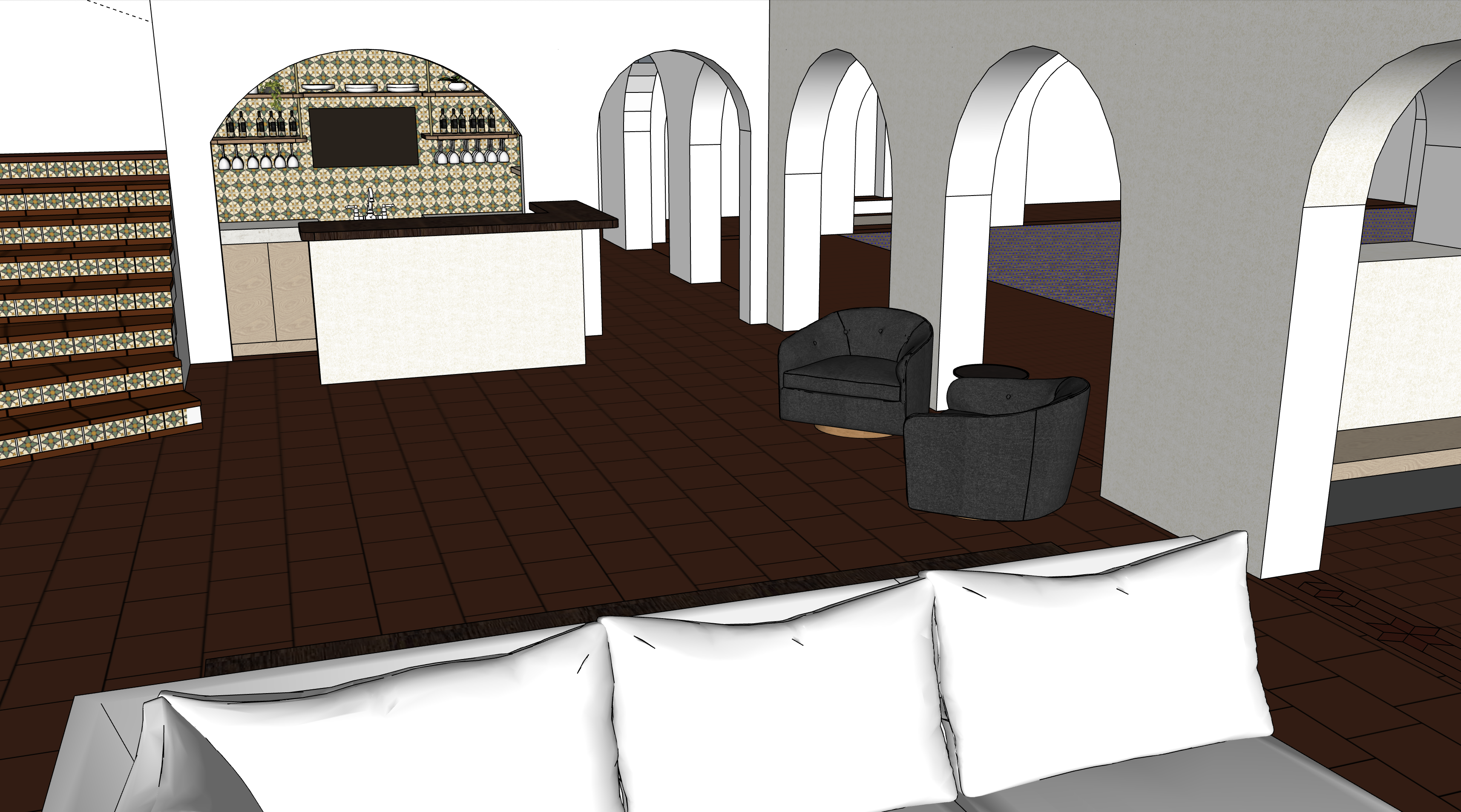 within every archway on the wall to the right is a black arched window outside the arched windows is an interior courtyard with decorative grasses and a multi stem plum in the corner just visible through the first arch on the right natural lighting should be coming in through the arched windows on the right