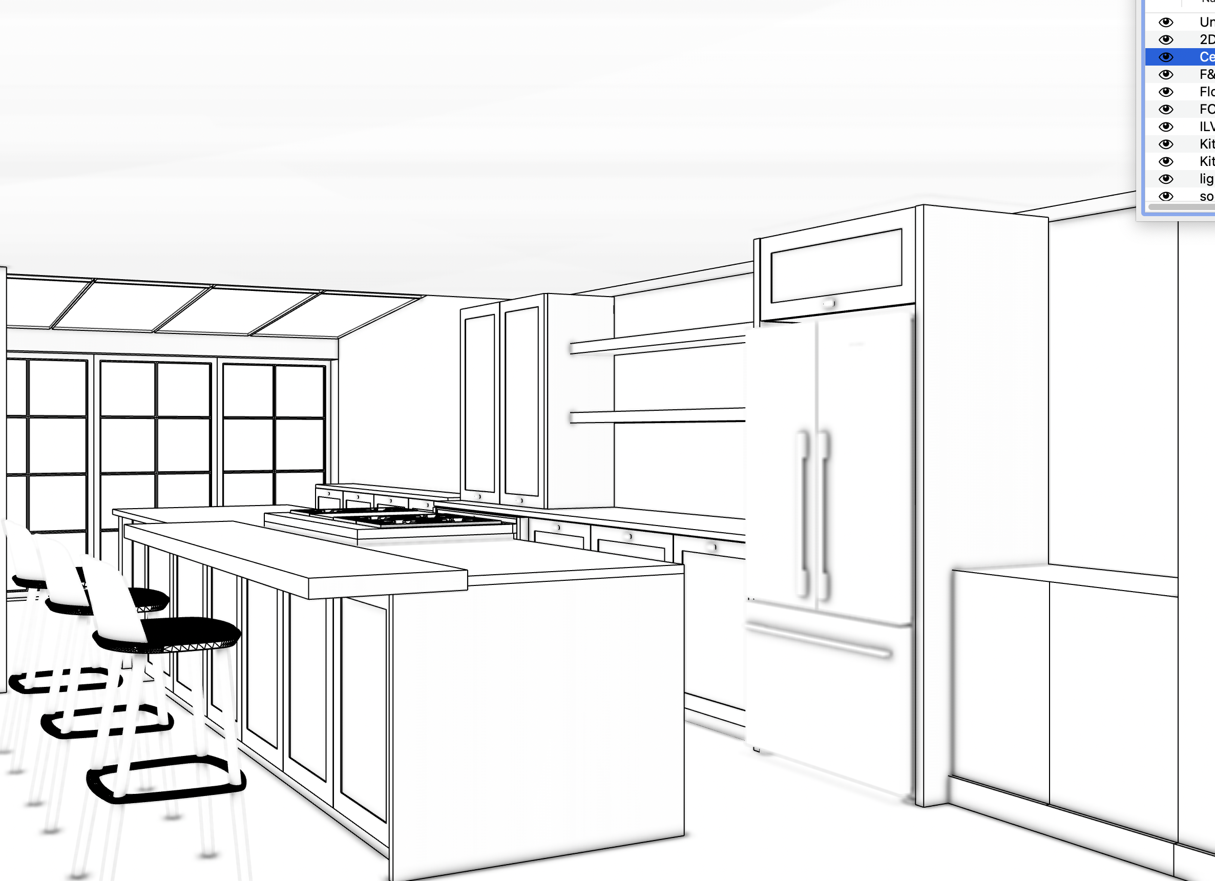 the glass roof at the end of the room is a fully sectional glass roof as drawn the worktop is not correct the image has a separate section of walnut wood on top of the main marble