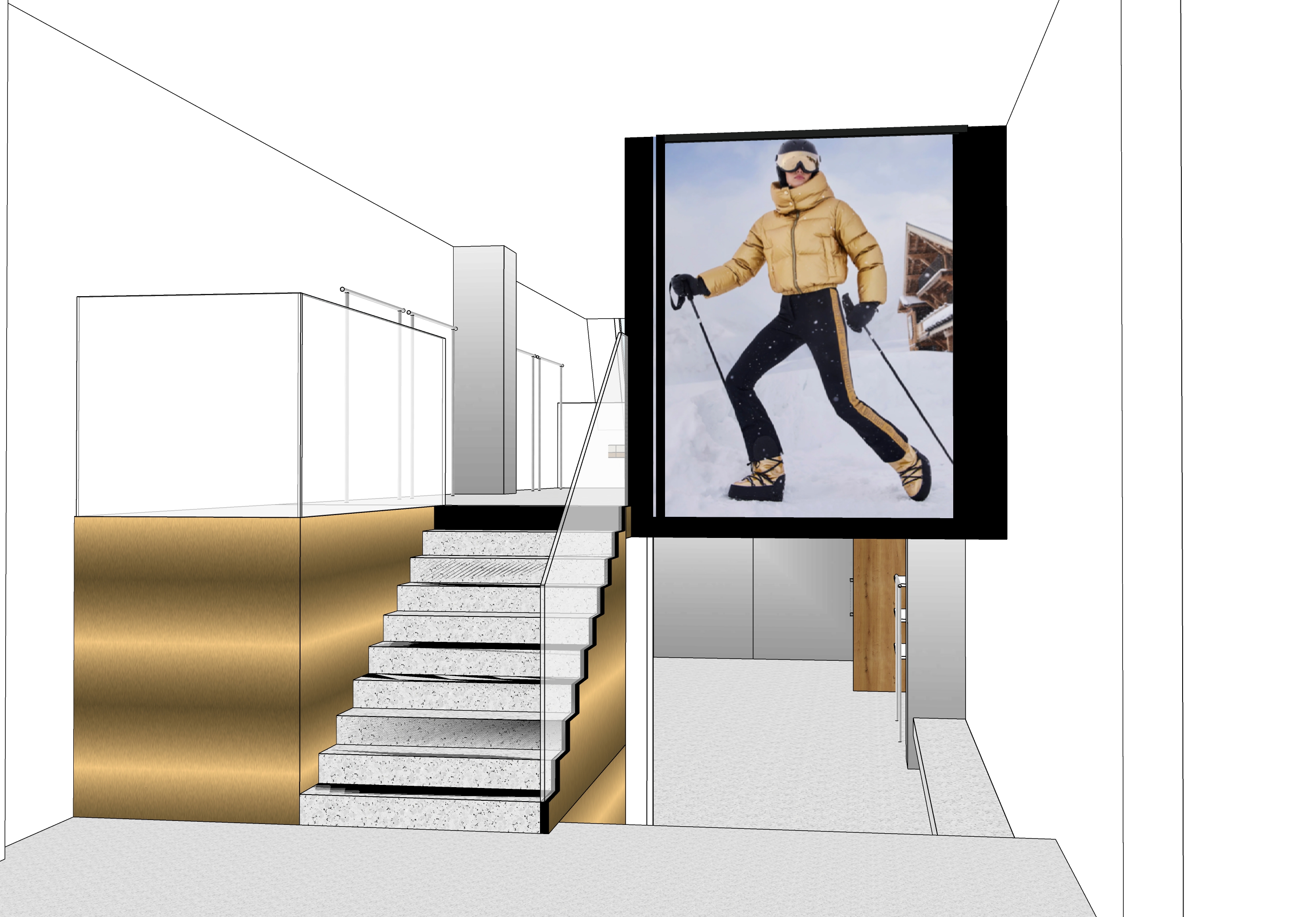 modernist interior shot interior realistic photo of a high end ski shop show messing details a glass ballustrade at stairs show white bright walls and ceilings put warm atmosphere spotlights in ceiling put jackets on hanger in clothing racks on the upper level architecture
