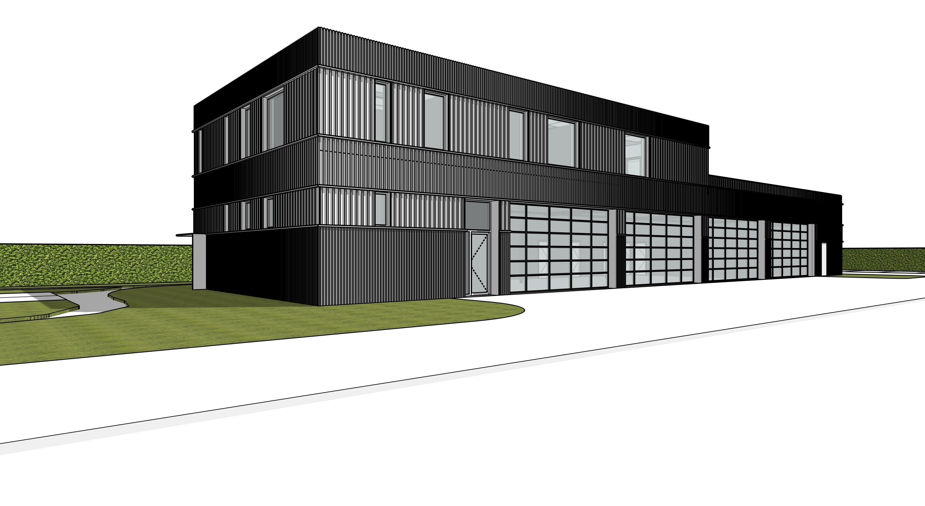 the image looks good please add trees behind the building making sure they do not obscure the architecture include approximately six people naturally distributed throughout the scene the setting should represent a summer day with a lightly clouded sky