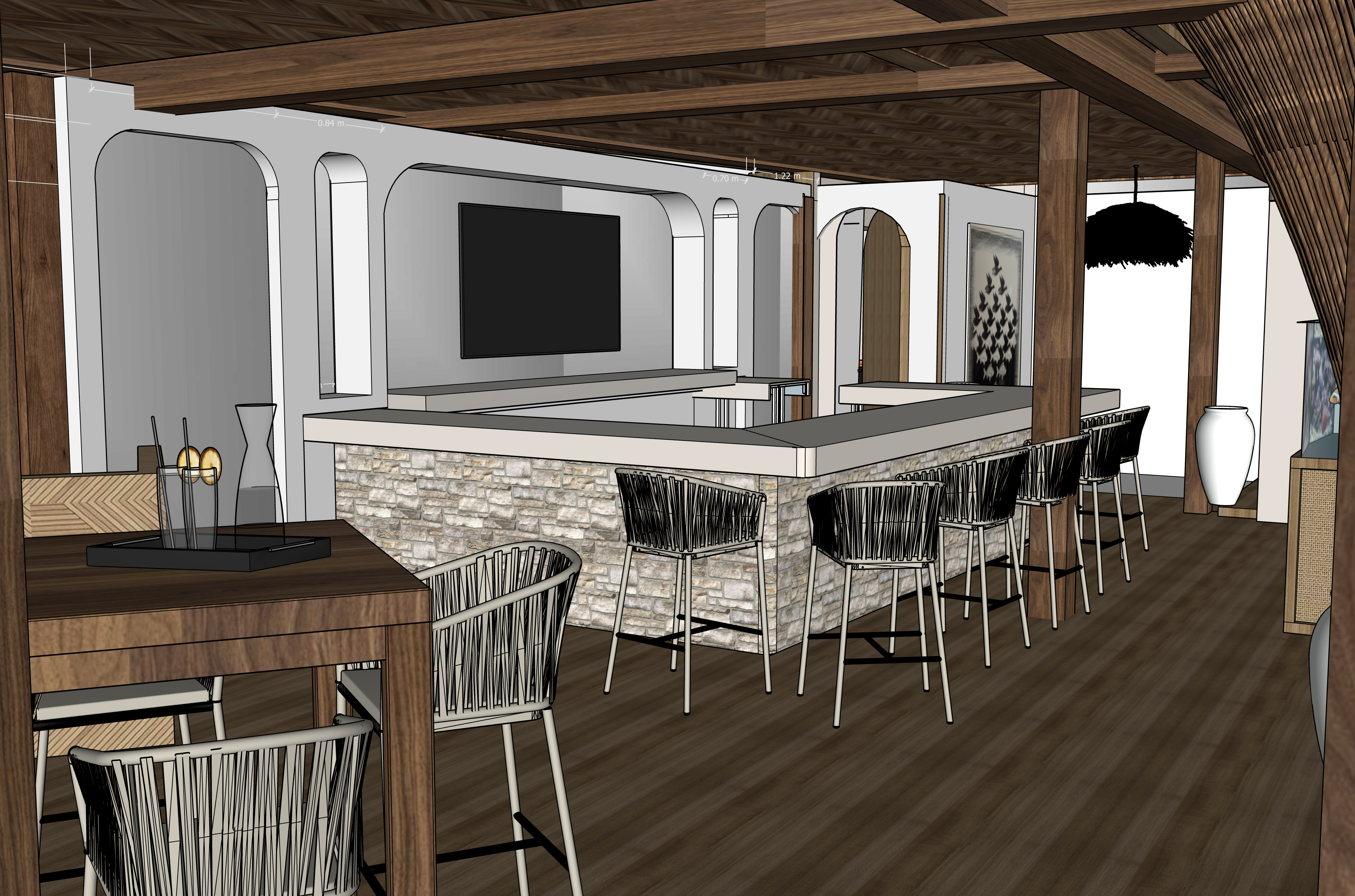 mediterrenean restaurant interior curved stone bar with indirect lighting wooden floor flat mirror backdrop all with indirect lighting in any curved space bottle displays and olive color bar stools
