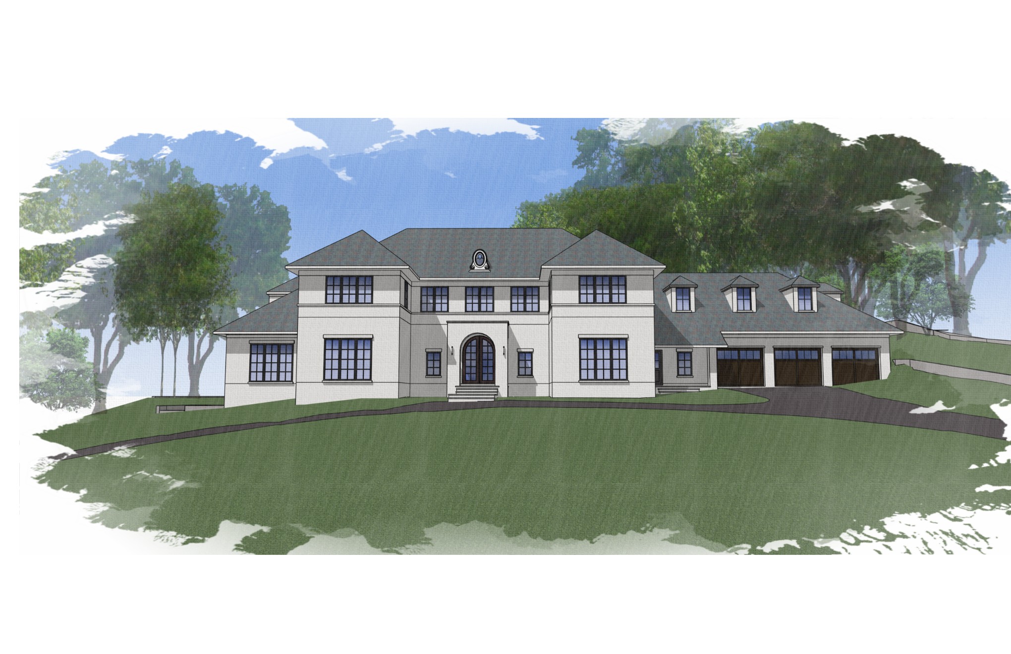 please create realistic rendering with realistic materials realistic landscaping with additional landscaping around the home such as garden beds keep driveway as shown