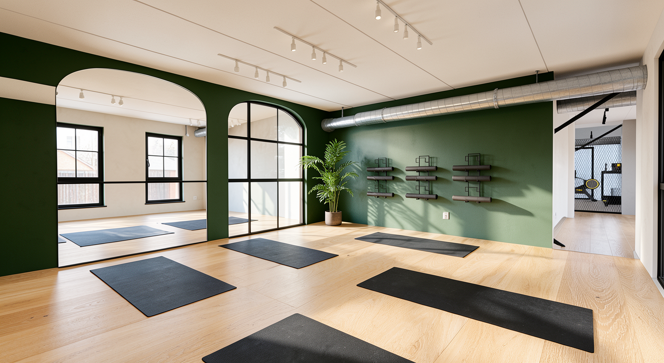 e una sala yoga a terra abbiamo un pavimento in parquet in rovere chiaro continuo a liscio sulla parete di destra ci sono in alto tubi in acciaio zincato sulla parete di sinistra ci sono due grandi specchio a forma di arco gli specchi riflettono la parete di fronte che ha una grande portefinestra divisa in quattro parti con cornici nere