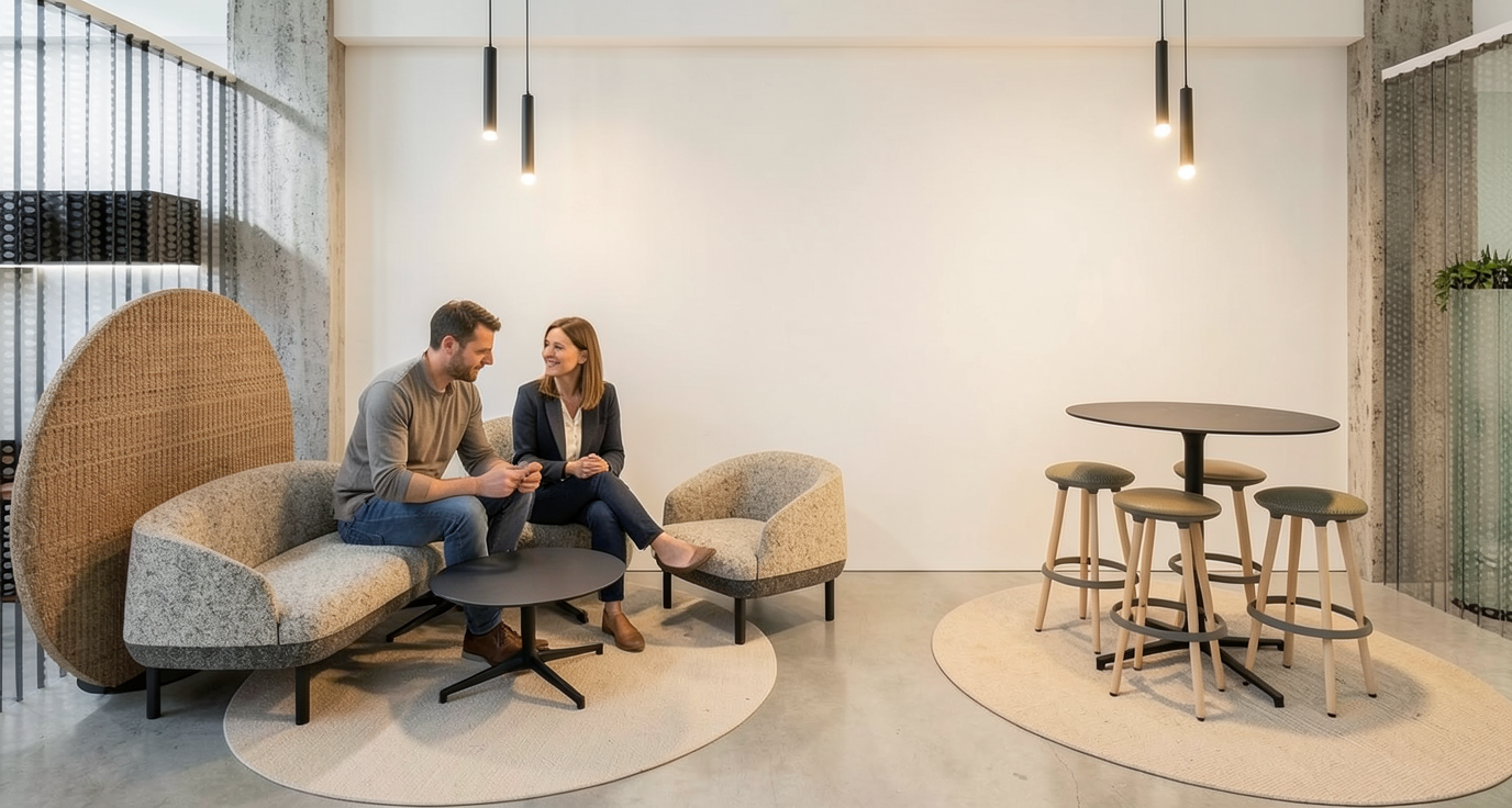 make this look photorealistic an event in the furniture showroom keep the original colors and finishes the white wall behind furniture needs to stay 2 people are sitting by the table one sits on the couch keep in mind that table on the right is 105 cm height make people smaller by 90 percent