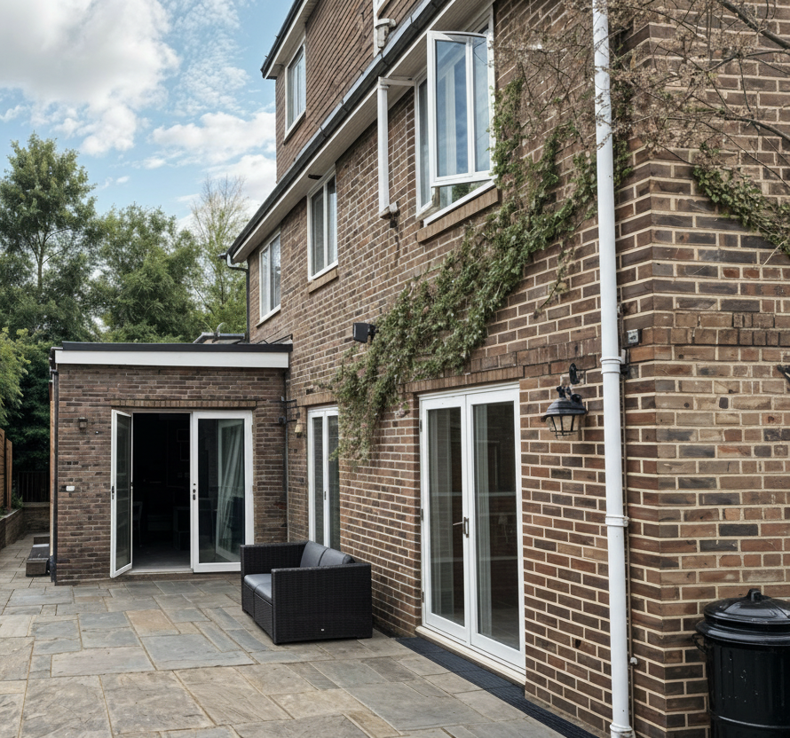 replace the extension with a new one for the whole lenght of the house with pivot doors