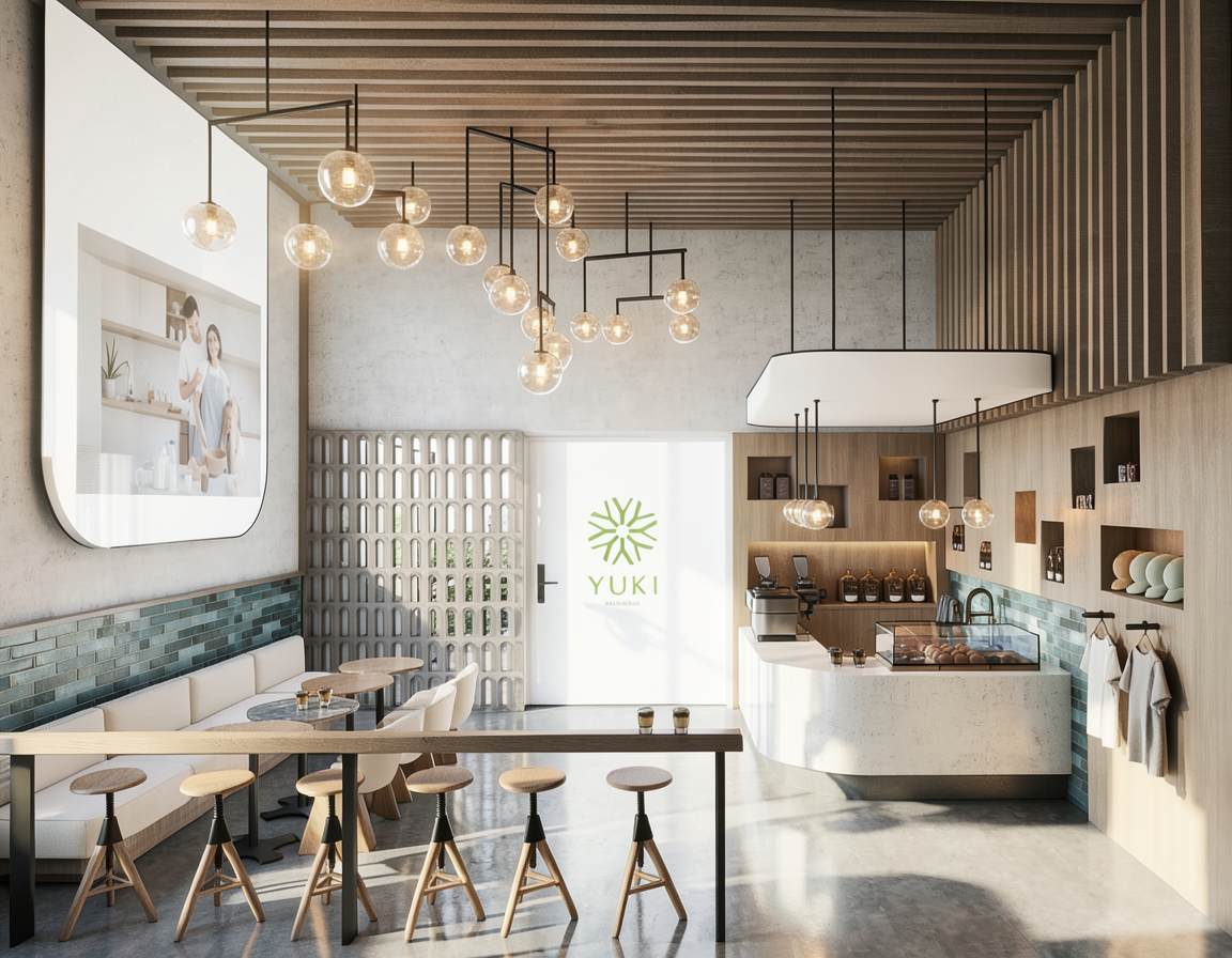 keep the indoor details and shooting angle in the image unchanged a modern caf interior with a minimalist and cozy atmosphere use light gray cement for the walls and floors to enhance the spaciousness incorporate soft wood tones for the shelves with ambient led and ceiling slats adding warmth and texture add pendant lights with soft warm white for a gentle inviting glow use teal blue tiles for the countertop backsplash to add a touch of color and contrast include white comfortable seating with light wood tables creating an elegant and welcoming space the overall ambiance should be calming and contemporary with a touch of elegance