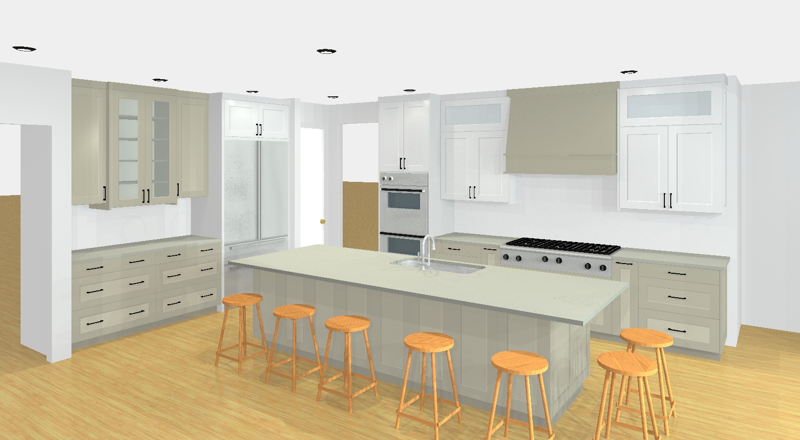 render a modern kitchen with a bright and welcoming atmosphere the white cabinets are a soft ivory the grey cabinets are a warm brown riftsawn white oak accented with sleek black handles the countertops and island are a darker granite emitting a subtle elegant glow the bar stools are crafted from light oak adding a touch of natural wood warmth appliances are a sleek stainless steel complementing the light airy ambiance the floor is a light pastel whitewash on oak the lighting is soft and recessed creating a cozy yet modern feel walls are painted in a crisp white making the space feel open and bright