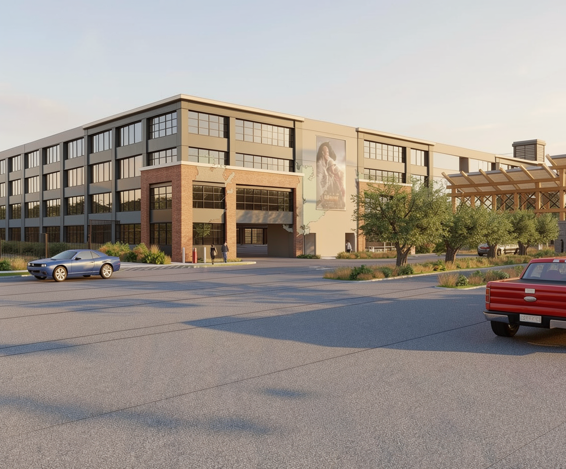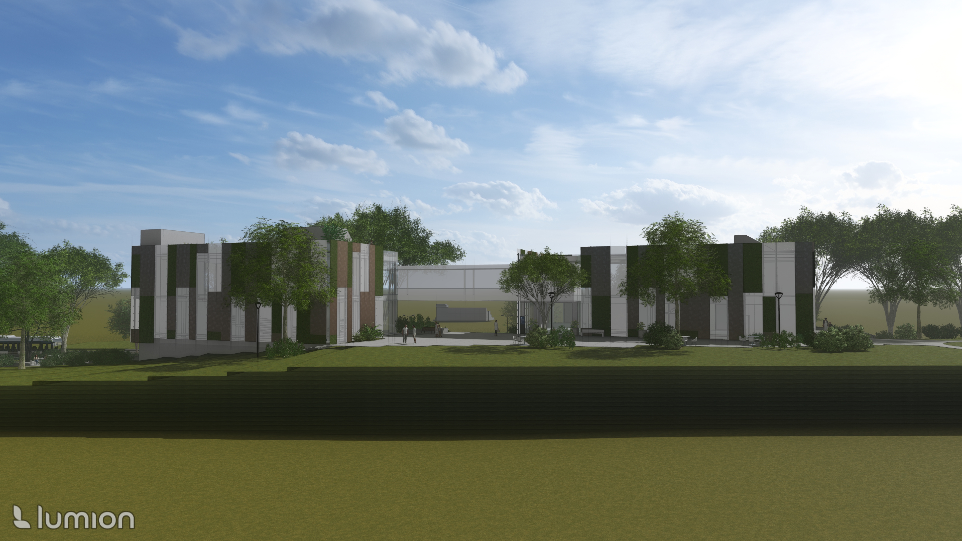 make this into a flat 2d elevation drawing more outlines on the building less of a render quality my professors like a ground line with the building coming straight up from it no perspective view the image is from straight on and the buildings are slightly crooked desaturate the sky make it more of a plain blue watercolor texture make the trees outline light gray vector lines maintain the cars and people but make them match the rest of the style and put the cars at the ground line make the roofline flat maintain the colors on the building but change the opacity maintain the green panels on the building the rooftops are flat make the ground a thin line with no color underneath make the grass on the sides a lighter watercolor texture lighten the sky to a very light watercolor texture make clear vector lines