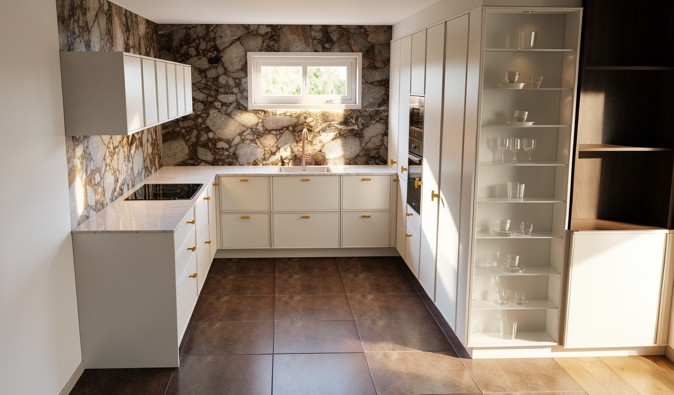 the walls are lightly plastered the lower cabinets are in stainless steel the floors are in ancient wood the wall lights are the median model from apparatus studio in alabaster the appartment is on the fourth floor of a parisian building the wooden beams are in light greige but more greyish elm and more irregular there are linen roman blinds on the windows the ceiling is in the same color as the walls the stone is taj mahal quartzite outside the window should be visible a parisian building window guard the dining table is in black oak the floorboards should be less large no lightbulbs should be seen on the pendant light style like athena calderone