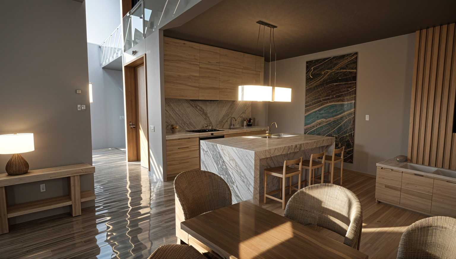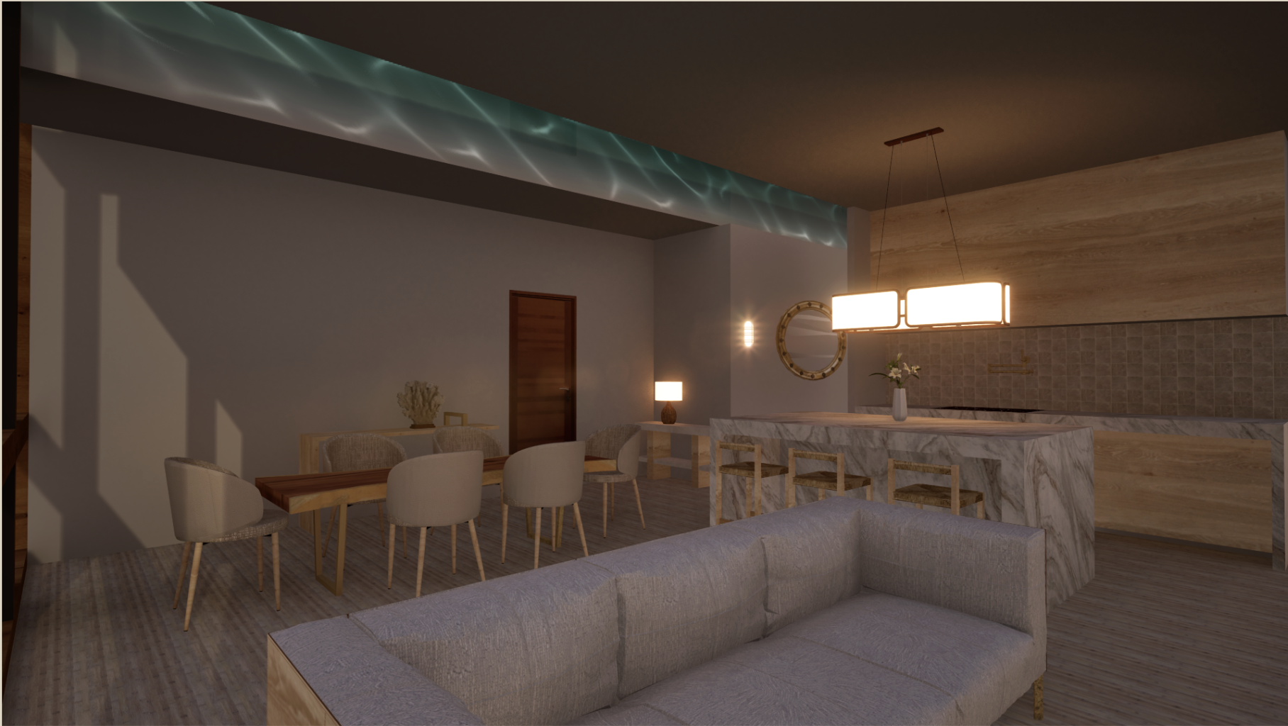 make this interior space photo realistic there is a pool above please make the sunlight shine through the pool and water ripple through the interior space